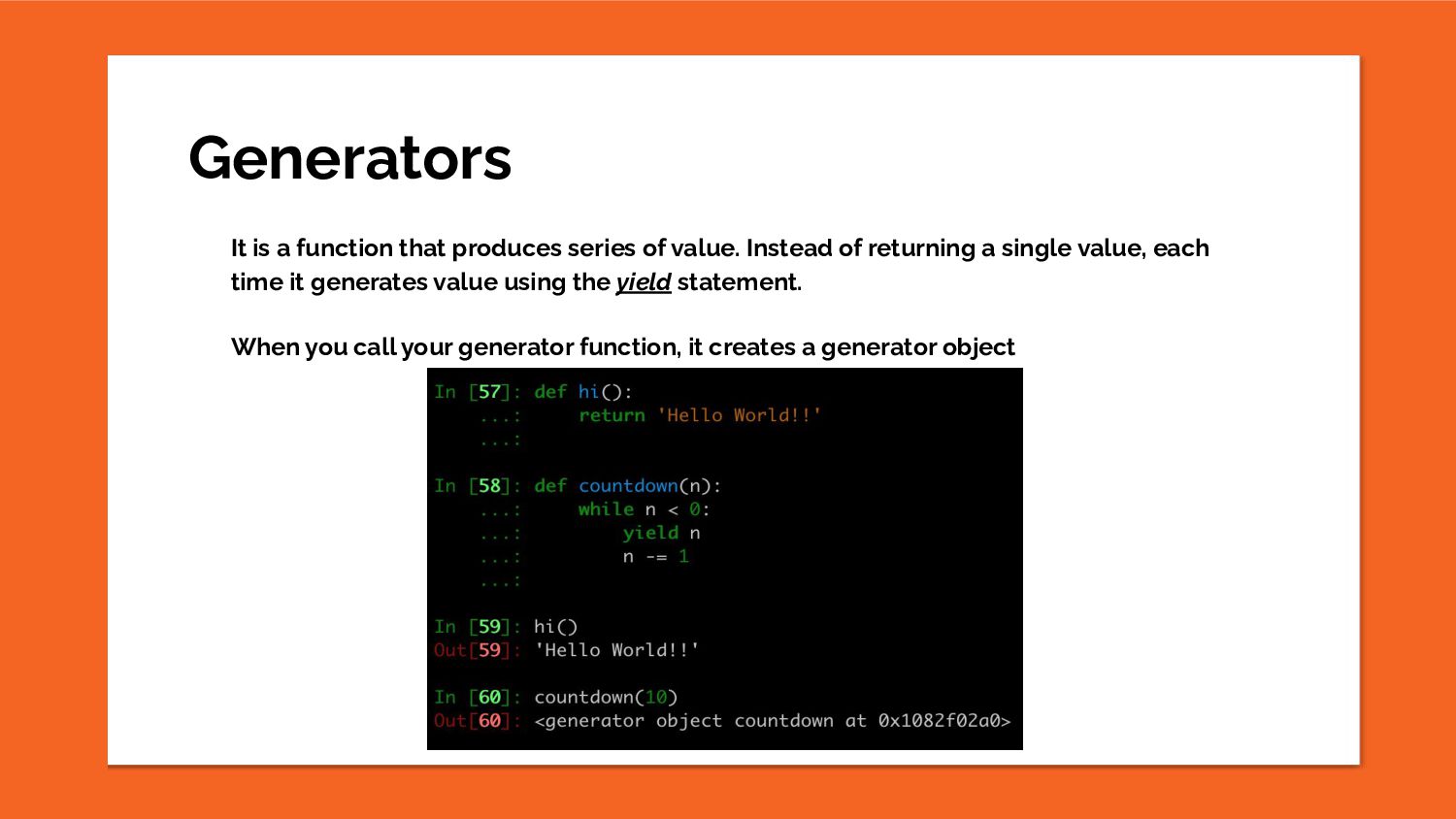 • You can now easily write your own iterator • Unlike iterator, generator can be iterated only once. • Yield keyword should be used in function • Generator function starts to yield value as your loop starts to run. When the for loop starts to run, generator function will run till first yield statement and return the value and as it continues it runs each time till yield. • Performs better when you have large data set. • When Generator returns, iteration stops (using conditions)