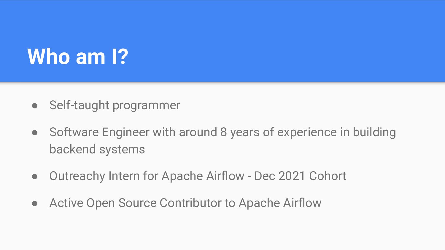 around 8 years of experience in building backend systems • Outreachy Intern for Apache Airflow - Dec 2021 Cohort • Active Open Source Contributor to Apache Airflow