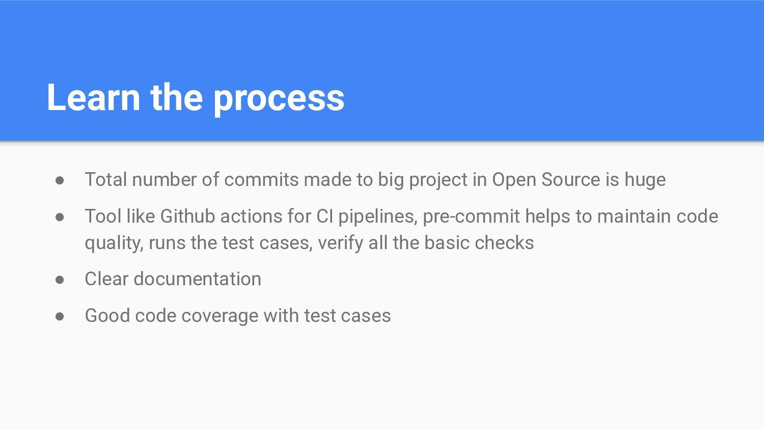 big project in Open Source is huge • Tool like Github actions for CI pipelines, pre-commit helps to maintain code quality, runs the test cases, verify all the basic checks • Clear documentation • Good code coverage with test cases
