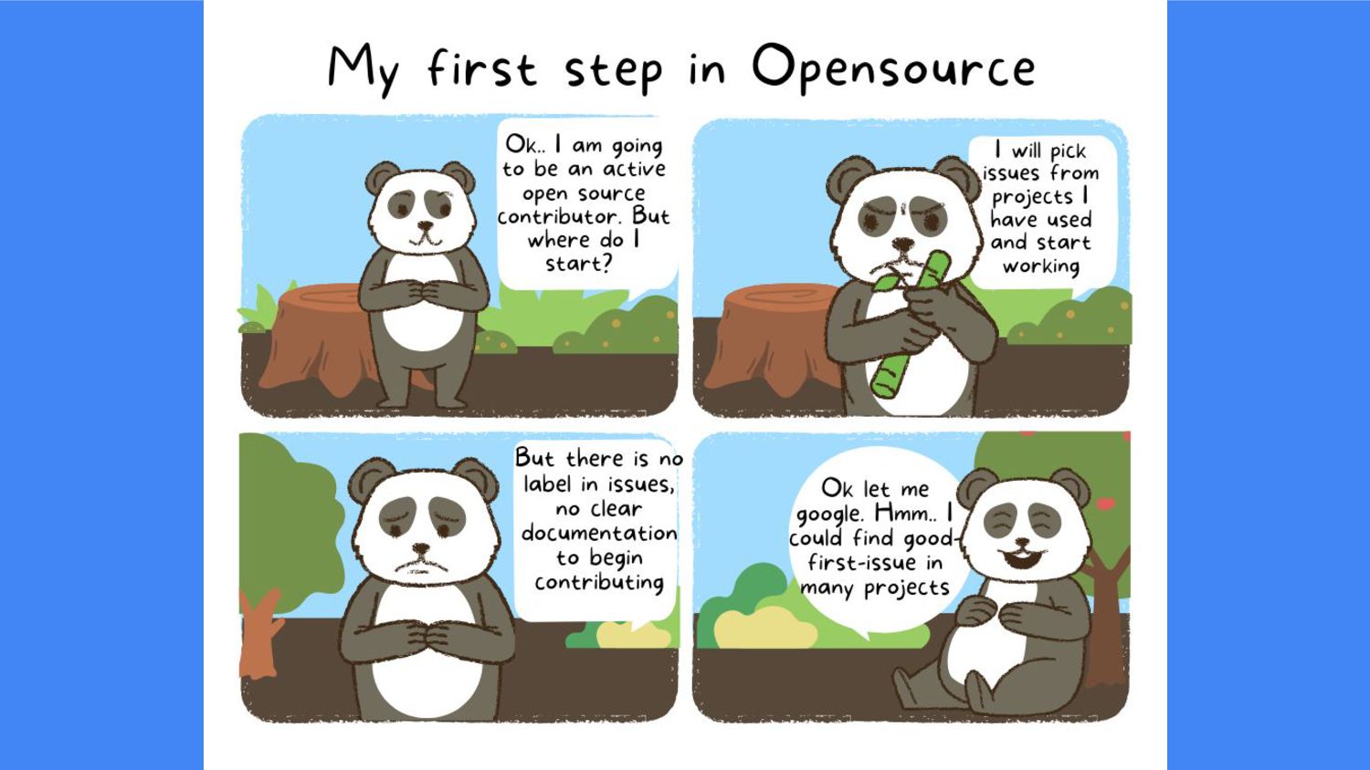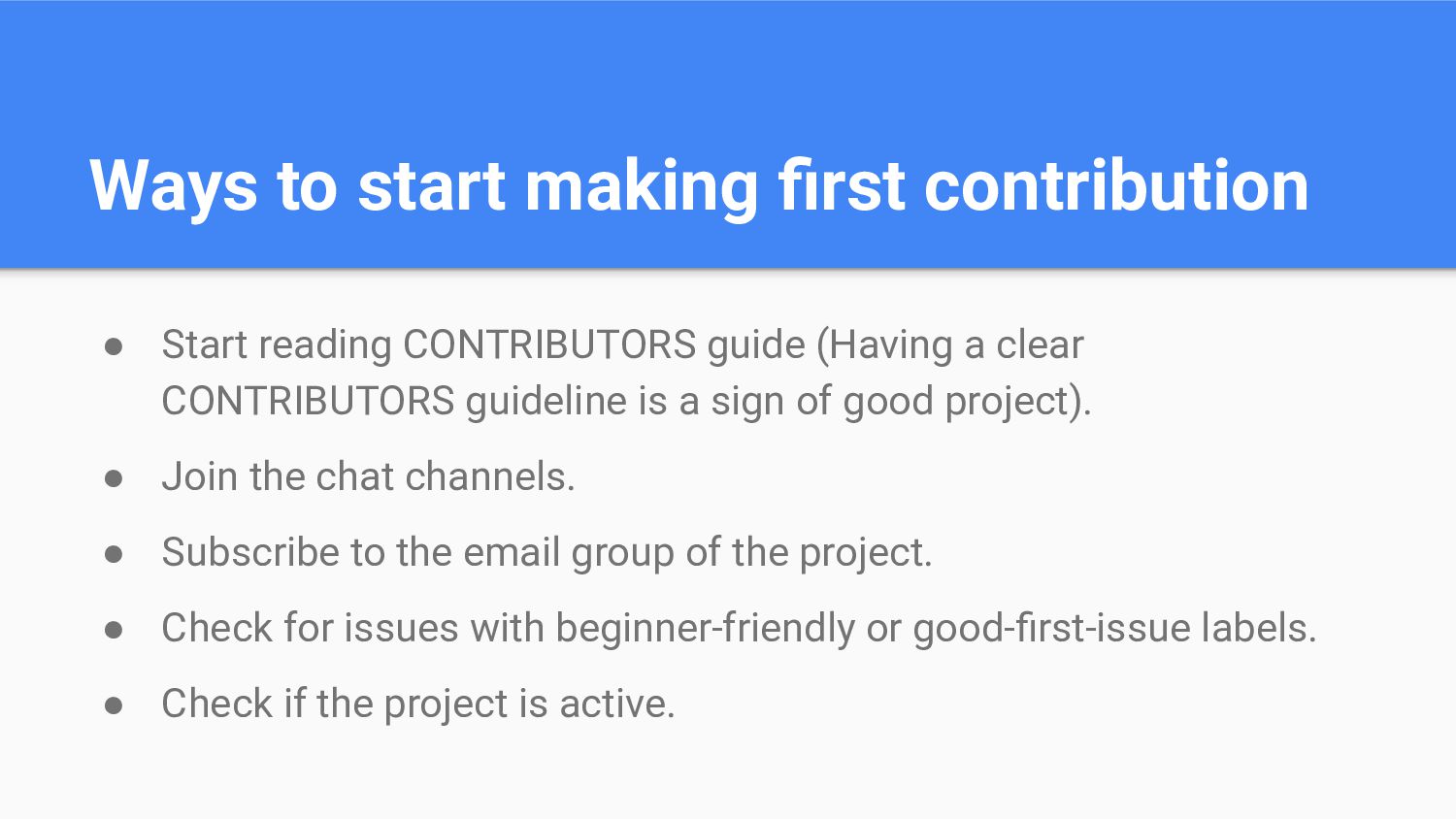 guide (Having a clear CONTRIBUTORS guideline is a sign of good project). • Join the chat channels. • Subscribe to the email group of the project. • Check for issues with beginner-friendly or good-first-issue labels. • Check if the project is active.