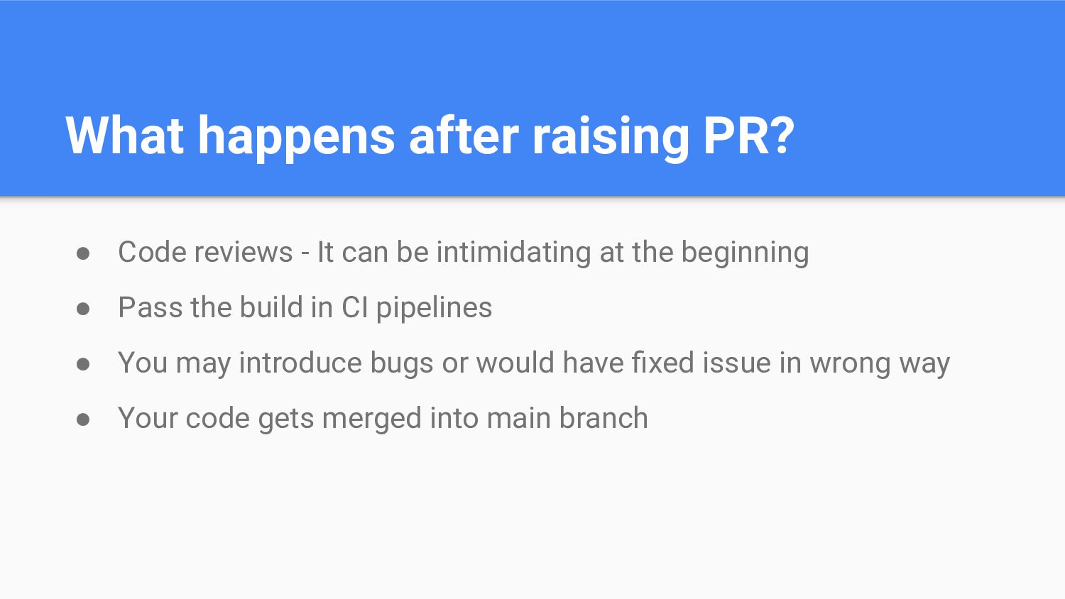 can be intimidating at the beginning • Pass the build in CI pipelines • You may introduce bugs or would have fixed issue in wrong way • Your code gets merged into main branch