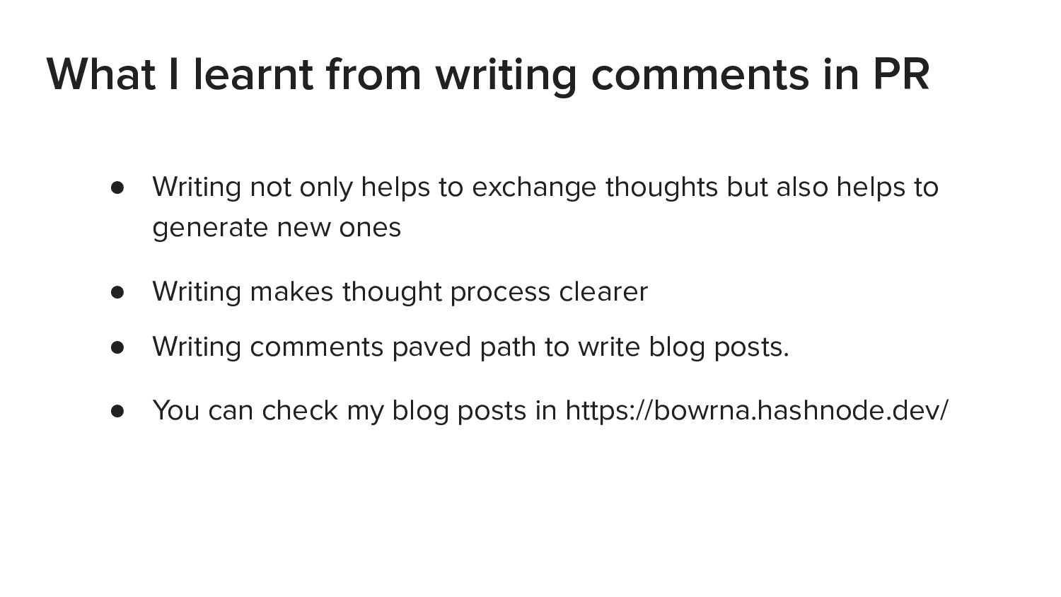not only helps to exchange thoughts but also helps to generate new ones • Writing makes thought process clearer • Writing comments paved path to write blog posts. • You can check my blog posts in https://bowrna.hashnode.dev/