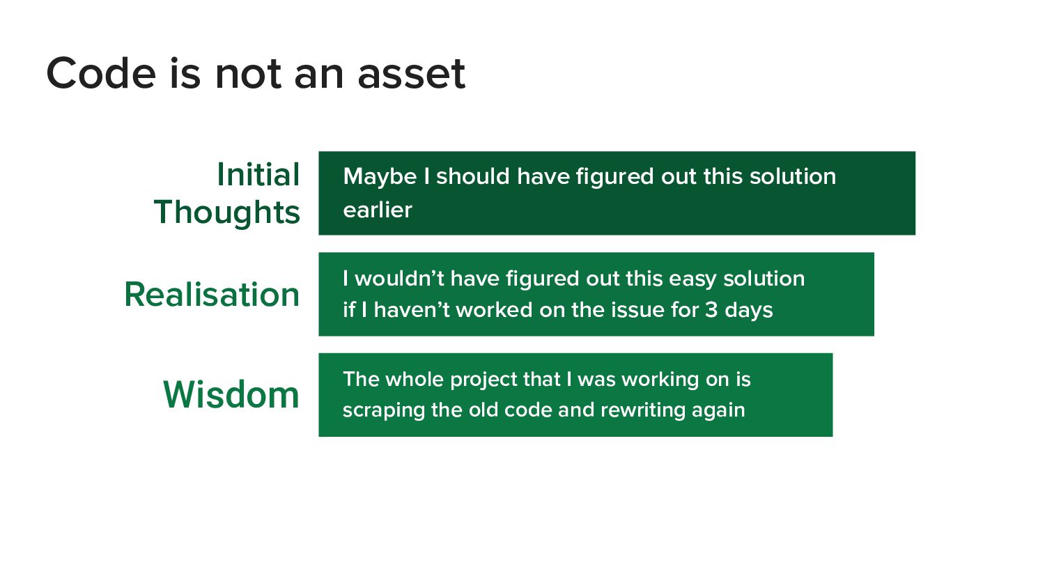 have figured out this solution earlier Realisation I wouldn’t have figured out this easy solution if I haven’t worked on the issue for 3 days Wisdom The whole project that I was working on is scraping the old code and rewriting again