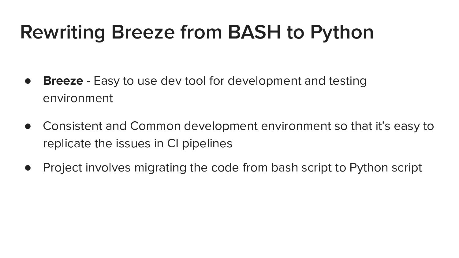 to use dev tool for development and testing environment • Consistent and Common development environment so that it’s easy to replicate the issues in CI pipelines • Project involves migrating the code from bash script to Python script