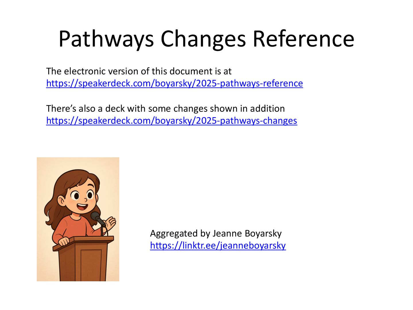 at https://speakerdeck.com/boyarsky/2025-pathways-reference There’s also a deck with some changes shown in addition https://speakerdeck.com/boyarsky/2025-pathways-changes Aggregated by Jeanne Boyarsky https://linktr.ee/jeanneboyarsky