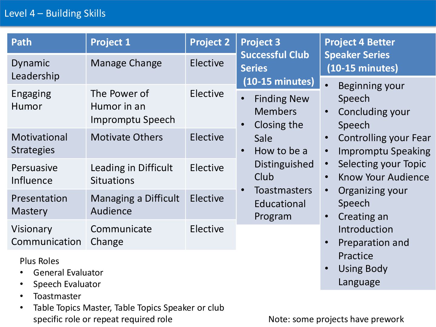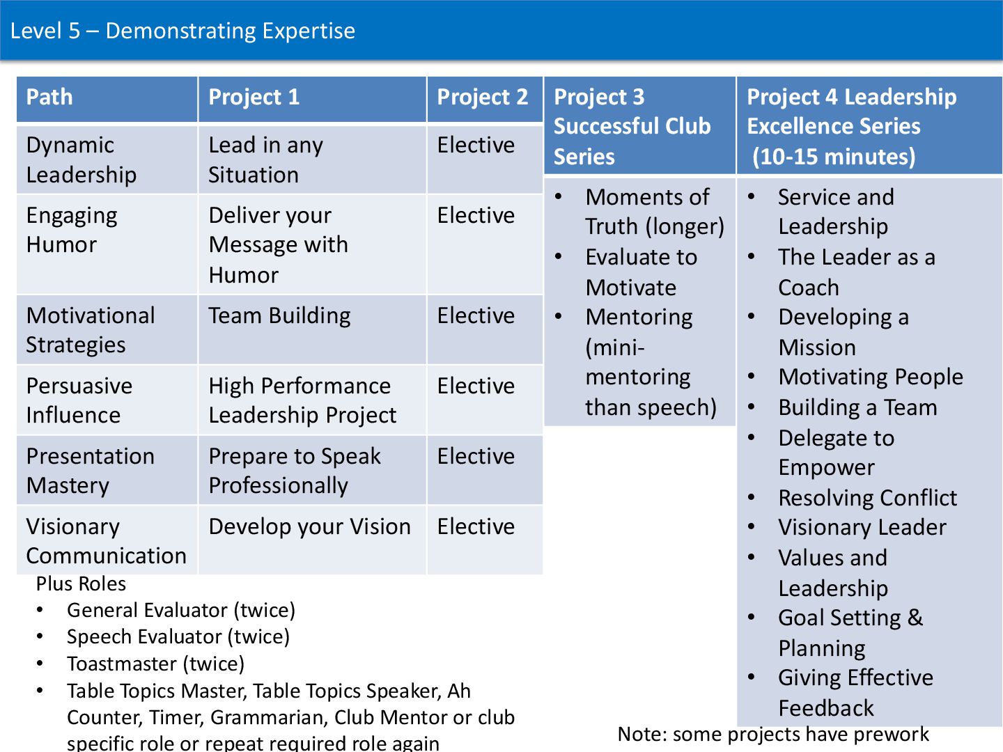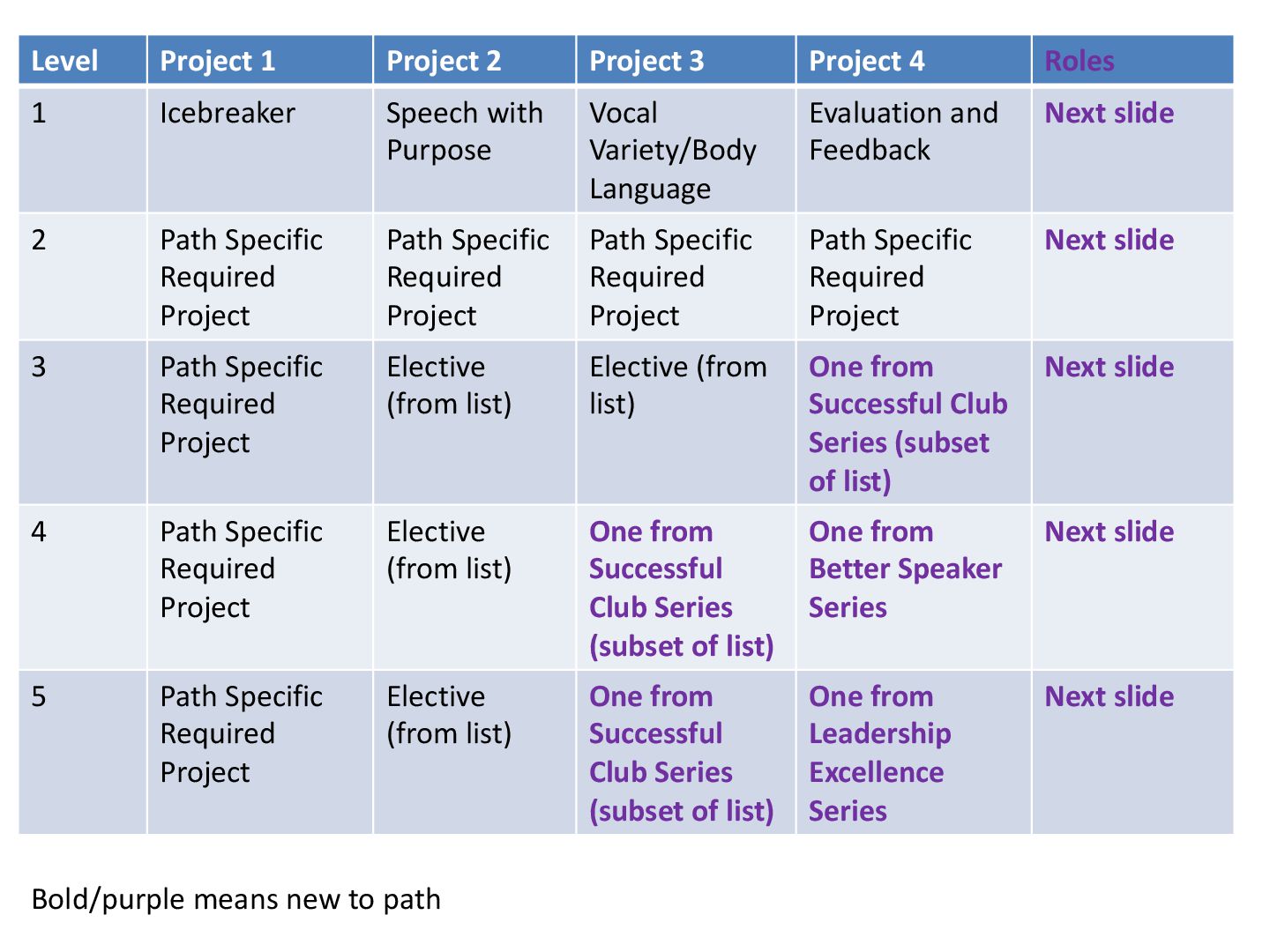 1 Icebreaker Speech with Purpose Vocal Variety/Body Language Evaluation and Feedback Next slide 2 Path Specific Required Project Path Specific Required Project Path Specific Required Project Path Specific Required Project Next slide 3 Path Specific Required Project Elective (from list) Elective (from list) One from Successful Club Series (subset of list) Next slide 4 Path Specific Required Project Elective (from list) One from Successful Club Series (subset of list) One from Better Speaker Series Next slide 5 Path Specific Required Project Elective (from list) One from Successful Club Series (subset of list) One from Leadership Excellence Series Next slide Bold/purple means new to path