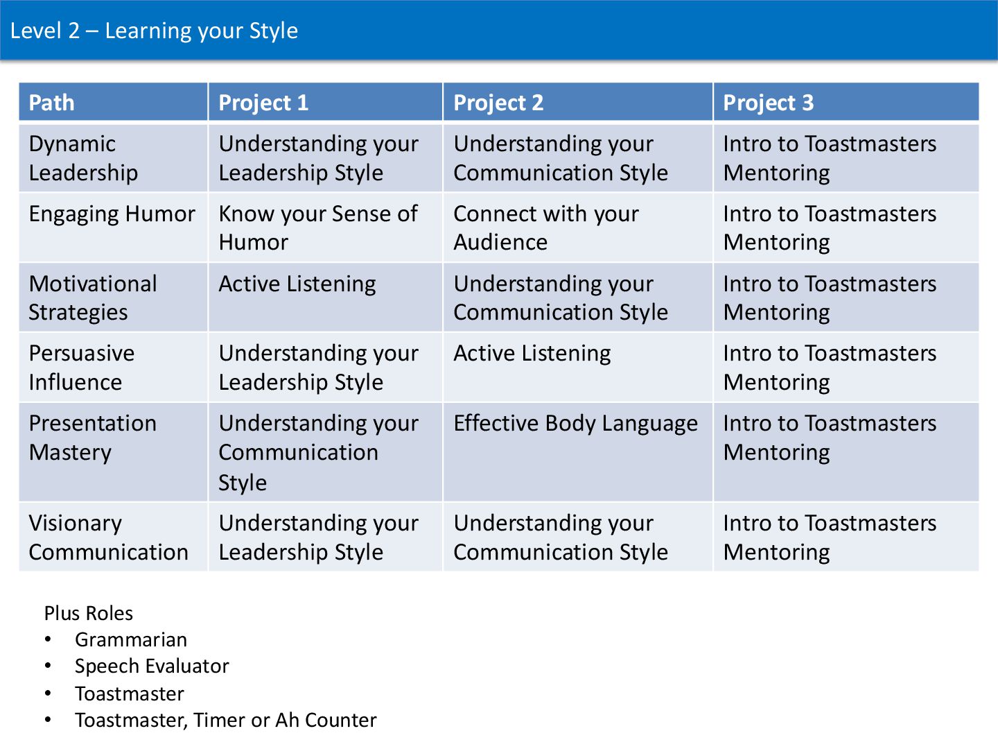 your Leadership Style Understanding your Communication Style Intro to Toastmasters Mentoring Engaging Humor Know your Sense of Humor Connect with your Audience Intro to Toastmasters Mentoring Motivational Strategies Active Listening Understanding your Communication Style Intro to Toastmasters Mentoring Persuasive Influence Understanding your Leadership Style Active Listening Intro to Toastmasters Mentoring Presentation Mastery Understanding your Communication Style Effective Body Language Intro to Toastmasters Mentoring Visionary Communication Understanding your Leadership Style Understanding your Communication Style Intro to Toastmasters Mentoring Plus Roles • Grammarian • Speech Evaluator • Toastmaster • Toastmaster, Timer or Ah Counter Level 2 – Learning your Style