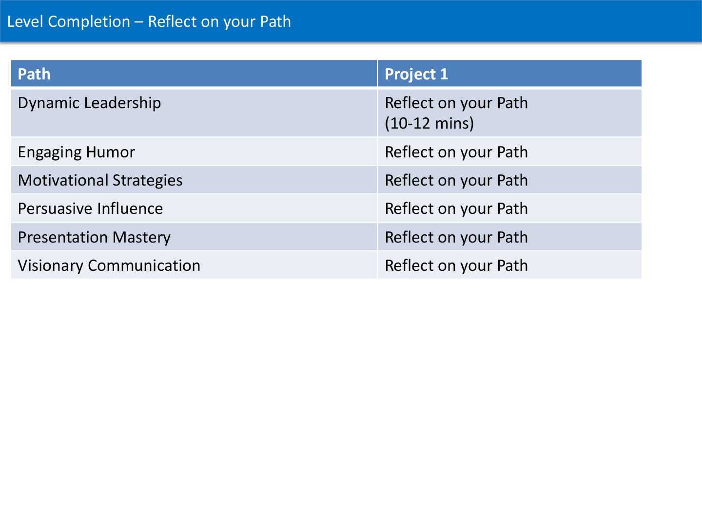 mins) Engaging Humor Reflect on your Path Motivational Strategies Reflect on your Path Persuasive Influence Reflect on your Path Presentation Mastery Reflect on your Path Visionary Communication Reflect on your Path Level Completion – Reflect on your Path