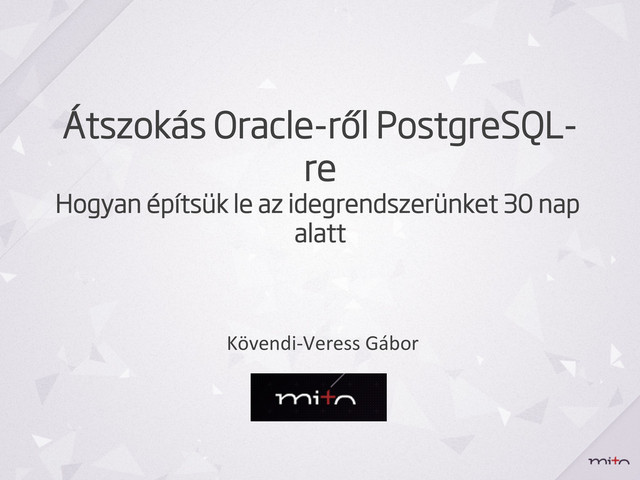 Célja a tapasztalatcsere. Semmiképpen sem szeretném összehasonlítani és szembeállítani őket, mivel a felhasználási területük különböző, és egy 1-1 elleni összahasonlításban nyilván nem nyerhet a PostgreSQL. Viszont érdekes téma, hogy amikor az egyikről hirtelen a másikba csöppen az ember, milyen problémákba futhat bele, amik nem triviálisak. (Kezdve az SQL szintakszistól (hintes joinok hiánya), az indexelés relevanciáján át (Postgre-ben indexelni... kétes eredményességgel jár), egészen az anomáliákig.