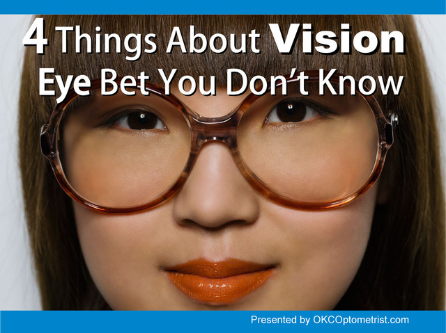 I know four things about vision eye bet you were unaware of. Vision is a unique gift we take for granted. Learn about these surprising facts by viewing our slide deck and reading a more in depth article at http://www.okcoptometrist.com/4-things-about-vision-eye-bet-you-didnt-know/
