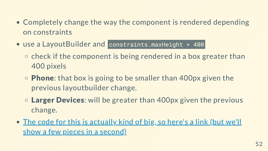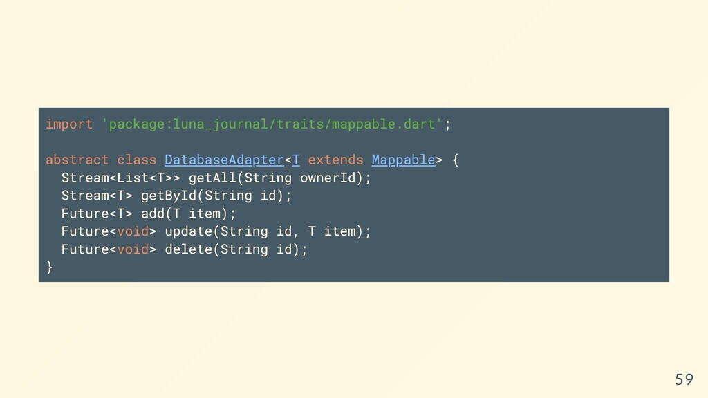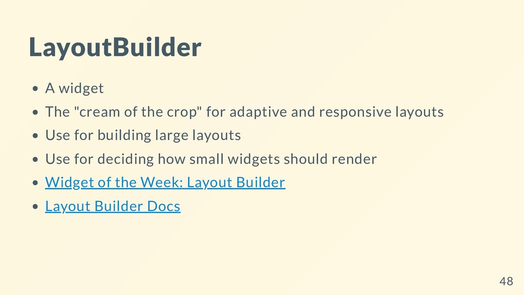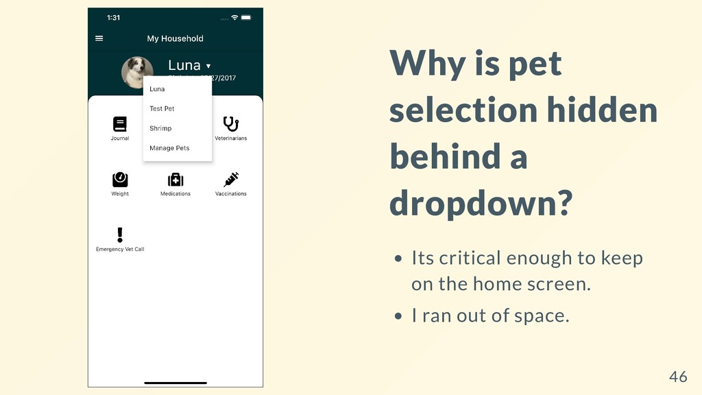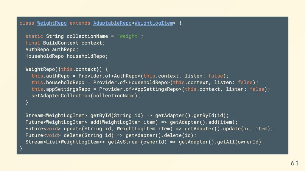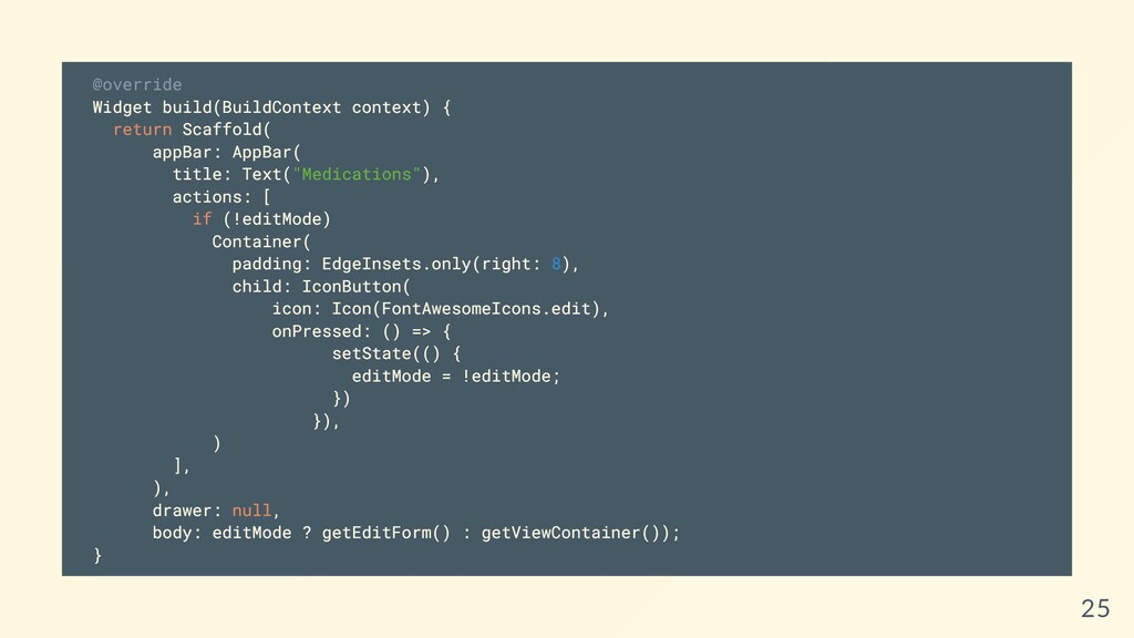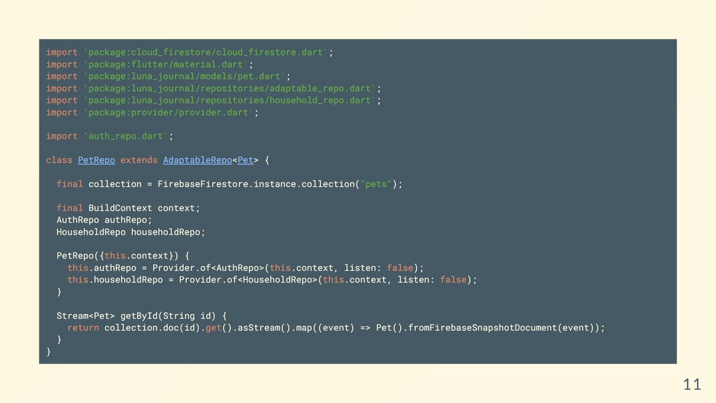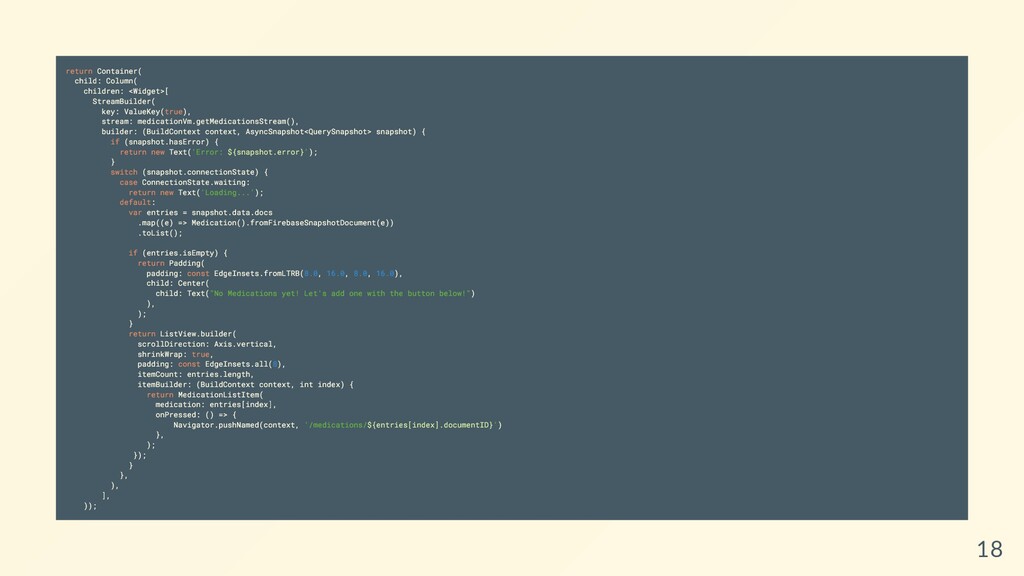 medicationVm.getMedicationsStream(), builder: (BuildContext context, AsyncSnapshot<QuerySnapshot> snapshot) { if (snapshot.hasError) { return new Text('Error: ${snapshot.error}'); } switch (snapshot.connectionState) { case ConnectionState.waiting: return new Text('Loading...'); default: var entries = snapshot.data.docs .map((e) => Medication().fromFirebaseSnapshotDocument(e)) .toList(); if (entries.isEmpty) { return Padding( padding: const EdgeInsets.fromLTRB(8.0, 16.0, 8.0, 16.0), child: Center( child: Text("No Medications yet! Let's add one with the button below!") ), ); } return ListView.builder( scrollDirection: Axis.vertical, shrinkWrap: true, padding: const EdgeInsets.all(8), itemCount: entries.length, itemBuilder: (BuildContext context, int index) { return MedicationListItem( medication: entries[index], onPressed: () => { Navigator.pushNamed(context, '/medications/${entries[index].documentID}') }, ); }); } }, ), ], )); 18