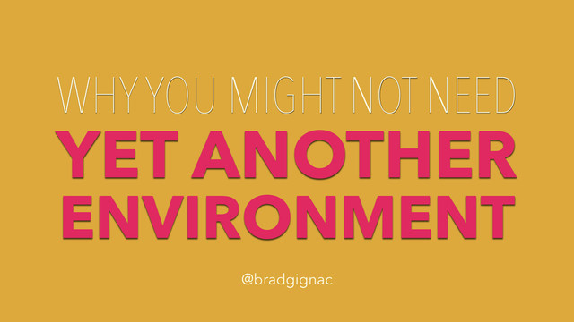 Multiple environments are a staple of software development projects, but do they actually help us make better software? Do they help us get it into the hands of customers faster? In this talk, I look at the goal of every development team -- delivering quality software. I review how environments have historically helped achieve this goal as well as the problems they have caused along the way. Finally, I look at alternative techniques that can be used in lieu of environments.