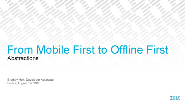 It's all too easy assume that your web or mobile app will run on a fast and reliable network with great coverage. The reality for your app's users, though, is often a slow and unreliable network with spotty coverage. What happens when the network doesn't work, or when the device is in airplane mode? You get unhappy, frustrated users. An offline-first app is an app that works, without error, when there is no network connection. An offline-first app can provide a better, faster user experience — both offline and online — by storing content and data locally and then applying progressive enhancement to synchronize with the cloud when a reliable network connection is available. An offline-first approach can be taken with Progressive Web Apps, mobile apps (native and hybrid), desktop apps (e.g. Electron), and Internet of Things (IoT) apps.