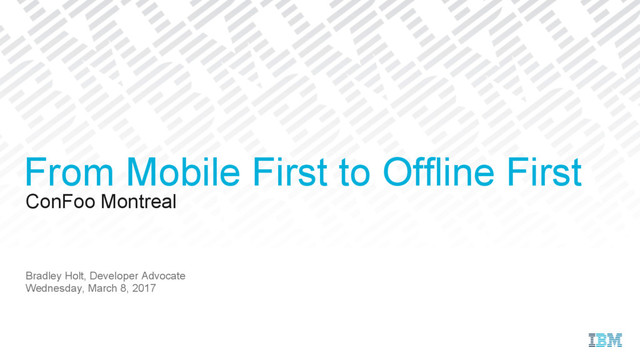 Offline First is an approach to application design in which a web, mobile, desktop, or Internet of Things application is built for offline usage first and is then progressively enhanced to take advantage of network connectivity when available. An Offline First app can provide a better, faster user experience — both offline and online — by storing content and data locally and synchronizing with the cloud when a network connection is available.
