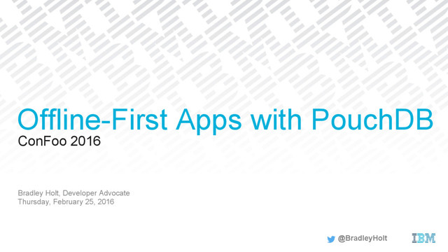 Web and mobile apps shouldn't stop working when there's no network connection. Based on Apache CouchDB, PouchDB is an open source syncing JavaScript database that runs within a web browser. Offline-first apps built using PouchDB can provide a better, faster user experience—both offline and online. Learn how to use the HTML5 Offline Application Cache, PouchDB, and CouchDB to build offline-enabled web and mobile apps.