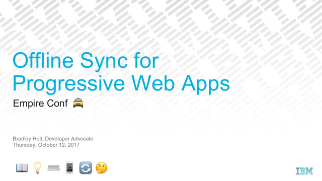 The Service Worker API can do most of the heavy lifting when it comes to storing URL-addressable content and assets for Offline First Progressive Web Apps. A bigger challenge can be storing and sync'ing your app's data. One of the best answers today for offline sync for Progressive Web Apps is a combination of Apache CouchDB (an open source document database), Hoodie (an open source Node.js backend for Offline First apps), and PouchDB (an open source JavaScript database that syncs). This stack can provide you with the starting point for your own Progressive Web App mobile backend and frontend, and it's entirely open source! You'll leave this workshop having built a fully-functional Offline First Progressive Web Apps using Service Workers, Apache CouchDB, Hoodie, and PouchDB. Some prerequisite knowledge of building web apps with JavaScript will be helpful for participants.