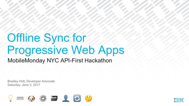 Learn how to build an Offline First Progressive Web App using Apache CouchDB, Hoodie, and PouchDB. Offline First apps provide a consistent user experience whether the user's device has no connectivity, limited connectivity, or great connectivity. A Progressive Web App combines the best parts both a web app and a native app. You browse to a Progressive Web App just like you browse to any other website. It lives at a URL, can be indexed by search engines, and can be linked to from anywhere else on the web. As you continue to use a Progressive Web App it gains additional native app-like capabilities. For example, the app could be installed to the home screen on your device. You might also grant the app the ability to send you push notifications, or the ability to access your camera, your microphone, or other device resources. This workshop will demonstrate how you can build offline sync into your Progressive Web App using a combination of Apache CouchDB (an open source document database), Hoodie (an open source Node.js backend for Offline First apps), and PouchDB (an open source JavaScript database that syncs).