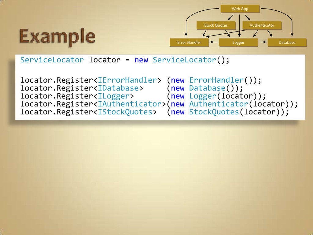TTo : TFrom; } public class Authenticator : IAuthenticator { readonly IDatabase database; readonly IErrorHandler errorHandler; readonly ILogger logger; public Authenticator(IDatabase database, IErrorHandler errorHandler, ILogger logger) { this.database = database; this.errorHandler = errorHandler; this.logger = logger; } } Authenticator Stock Quotes Error Handler Logger Database Web App