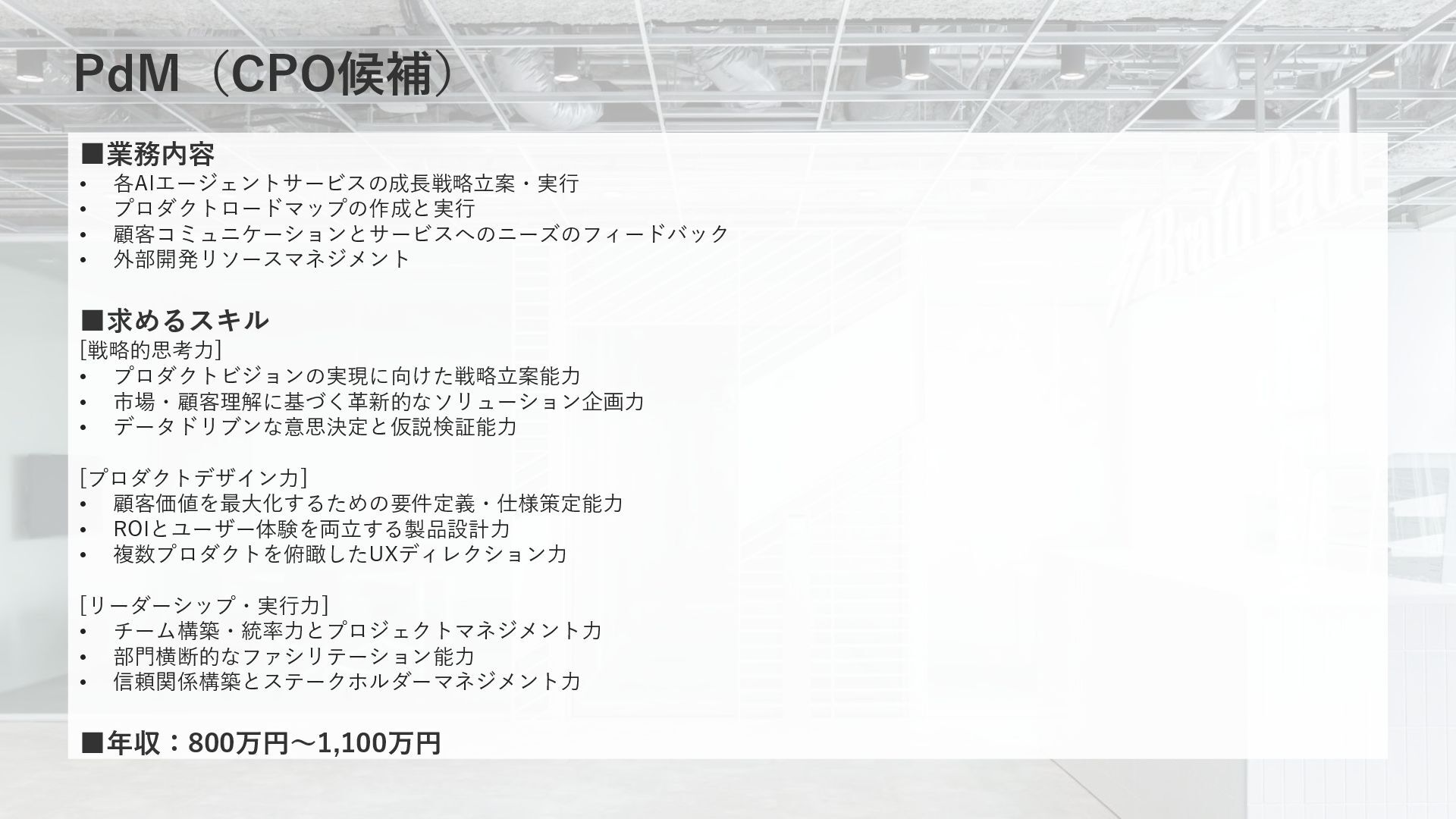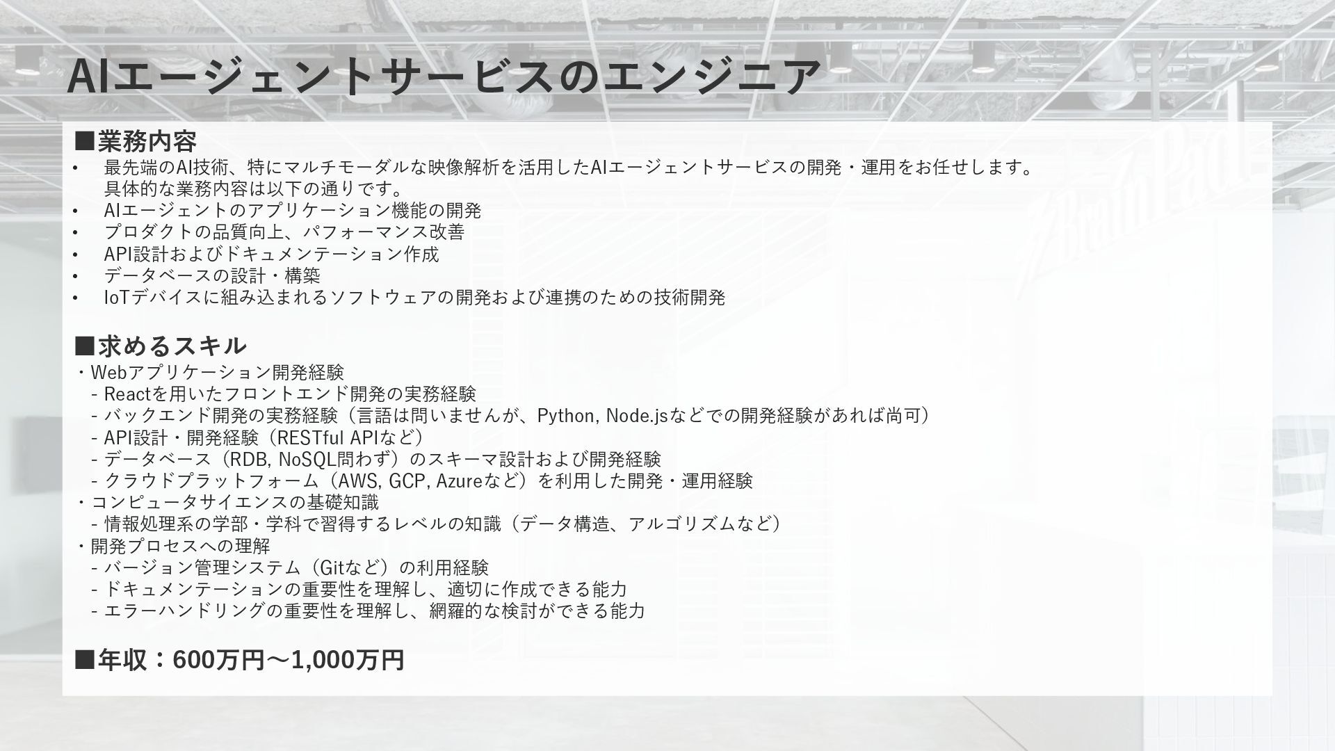 AIエージェントのアプリケーション機能の開発 • プロダクトの品質向上、パフォーマンス改善 • API設計およびドキュメンテーション作成 • データベースの設計・構築 • IoTデバイスに組み込まれるソフトウェアの開発および連携のための技術開発 ▪求めるスキル ・Webアプリケーション開発経験 - Reactを用いたフロントエンド開発の実務経験 - バックエンド開発の実務経験(言語は問いませんが、Python, Node.jsなどでの開発経験があれば尚可) - API設計・開発経験(RESTful APIなど) - データベース(RDB, NoSQL問わず)のスキーマ設計および開発経験 - クラウドプラットフォーム(AWS, GCP, Azureなど)を利用した開発・運用経験 ・コンピュータサイエンスの基礎知識 - 情報処理系の学部・学科で習得するレベルの知識(データ構造、アルゴリズムなど) ・開発プロセスへの理解 - バージョン管理システム(Gitなど)の利用経験 - ドキュメンテーションの重要性を理解し、適切に作成できる能力 - エラーハンドリングの重要性を理解し、網羅的な検討ができる能力 ▪年収:600万円~1,000万円 AIエージェントサービスのエンジニア