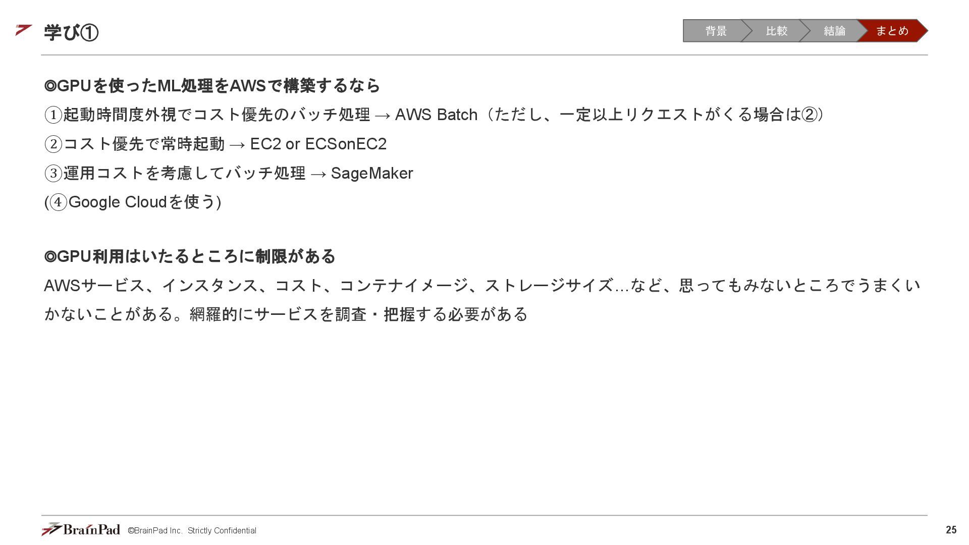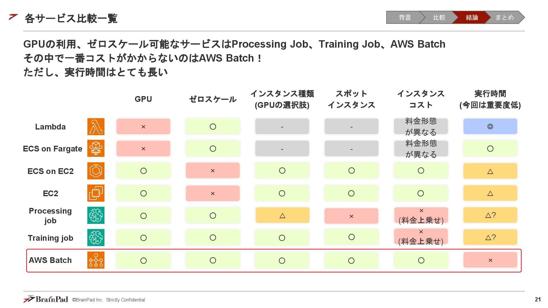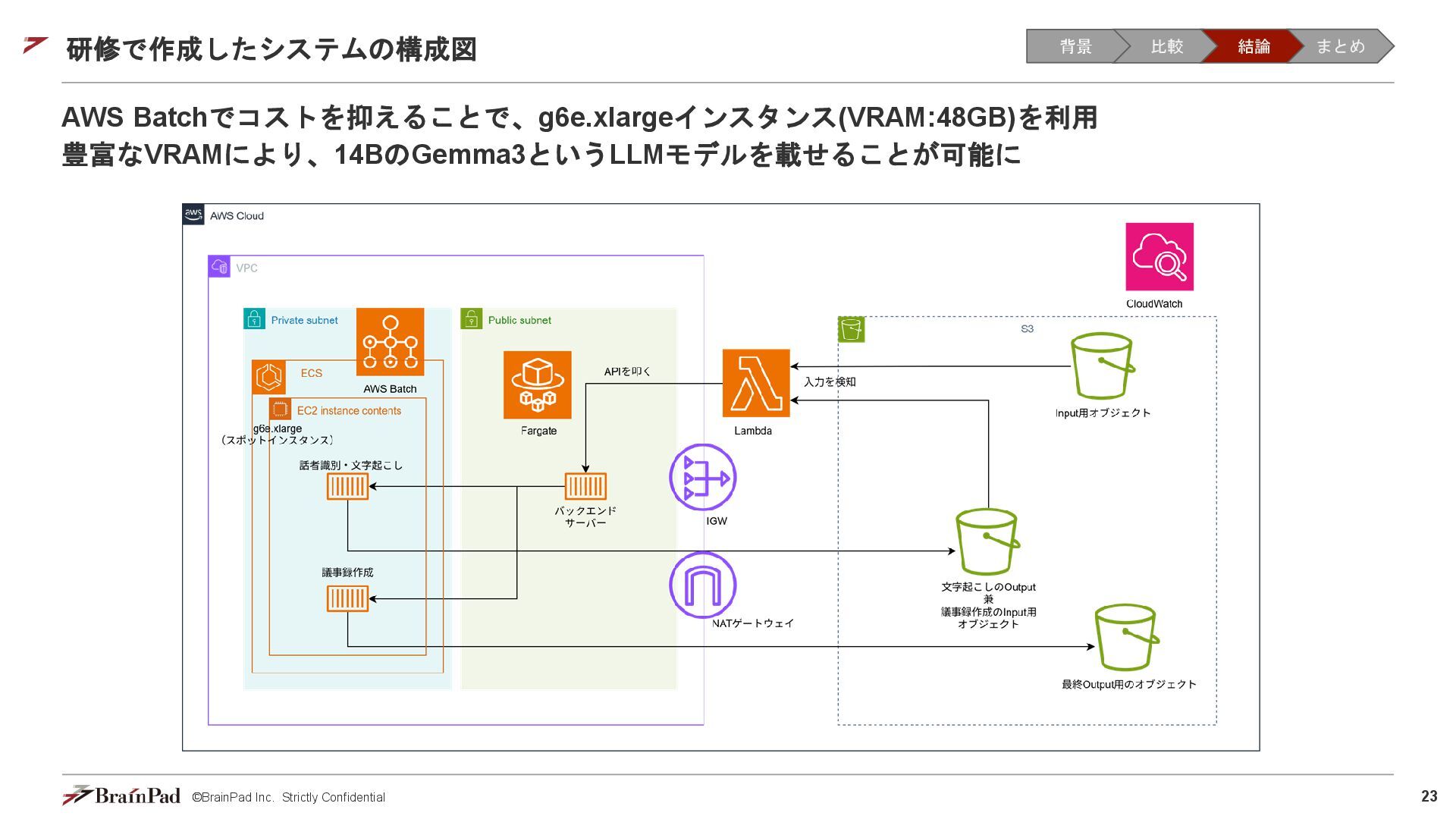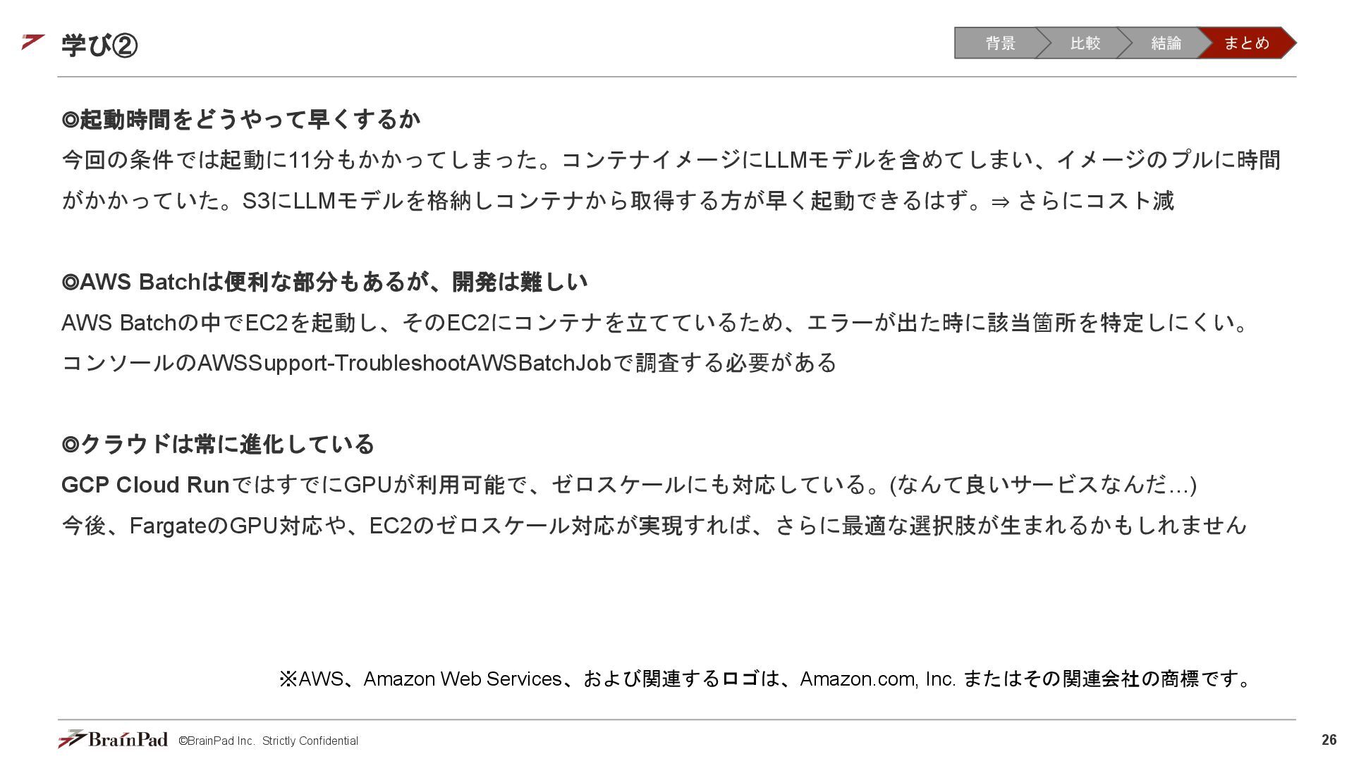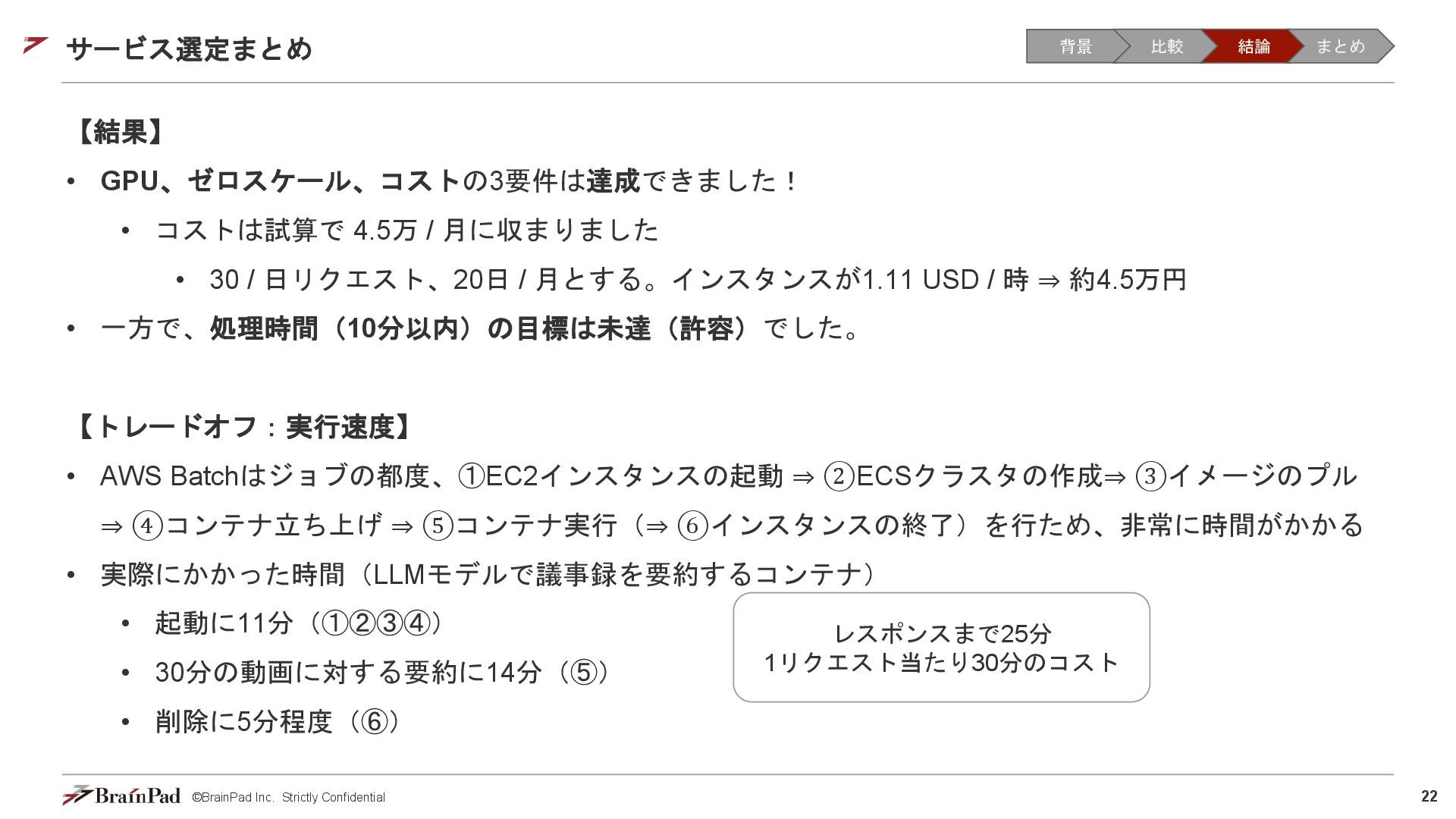 コストは試算で 4.5万 / 月に収まりました • 30 / 日リクエスト、20日 / 月とする。インスタンスが1.11 USD / 時 ⇒ 約4.5万円 • 一方で、処理時間(10分以内)の目標は未達(許容)でした。 【トレードオフ:実行速度】 • AWS Batchはジョブの都度、①EC2インスタンスの起動 ⇒ ②ECSクラスタの作成⇒ ③イメージのプル ⇒ ④コンテナ立ち上げ ⇒ ⑤コンテナ実行(⇒ ⑥インスタンスの終了)を行ため、非常に時間がかかる • 実際にかかった時間(LLMモデルで議事録を要約するコンテナ) • 起動に11分(①②③④) • 30分の動画に対する要約に14分(⑤) • 削除に5分程度(⑥) レスポンスまで25分 1リクエスト当たり30分のコスト 背景 比較 結論 まとめ