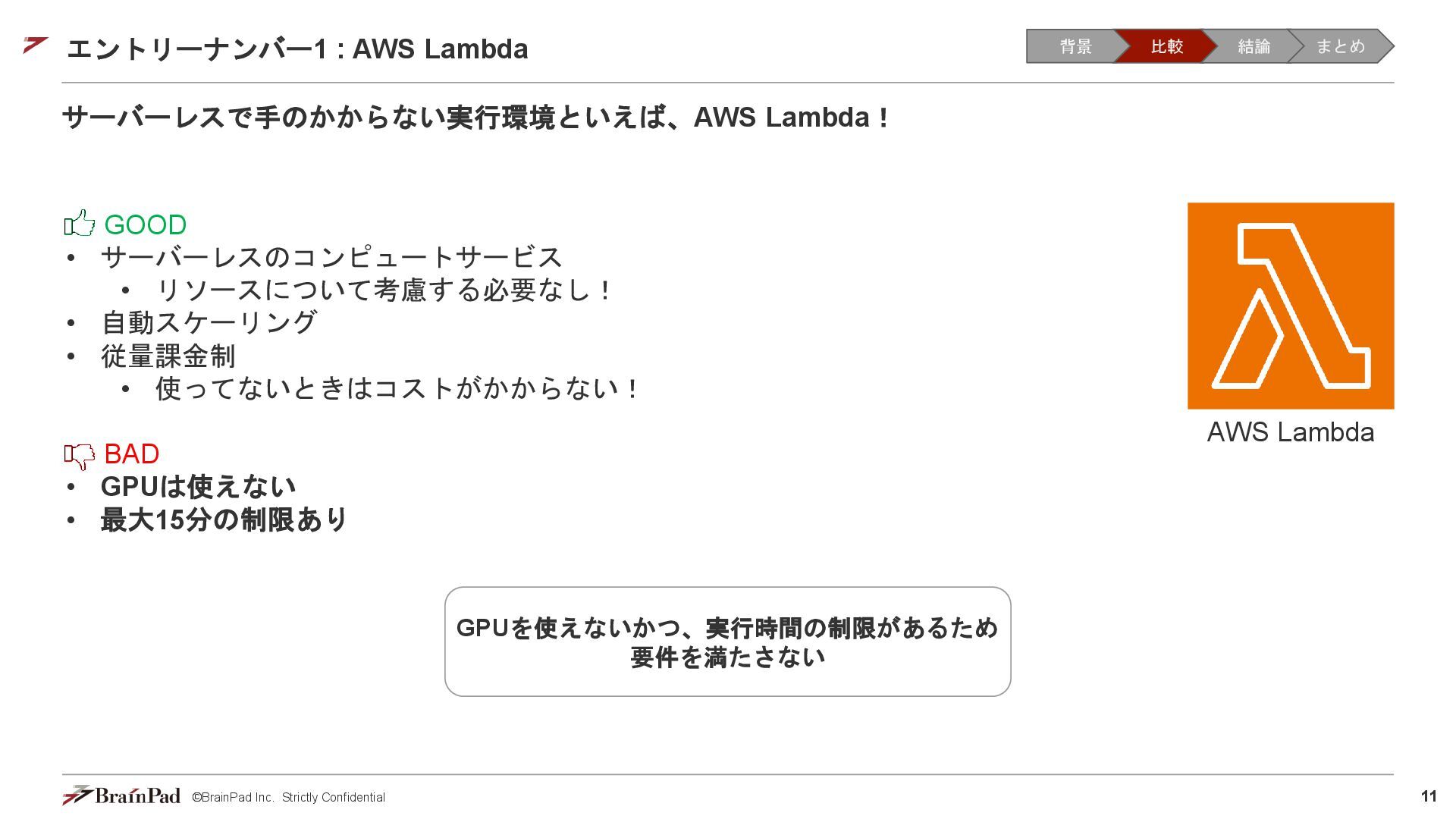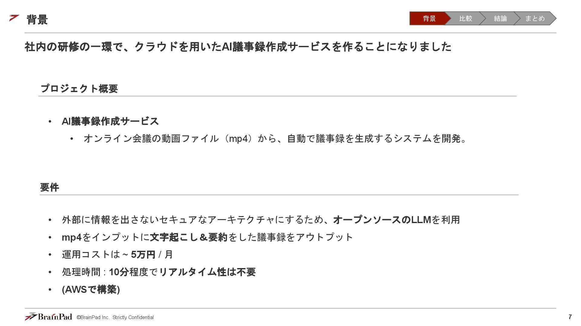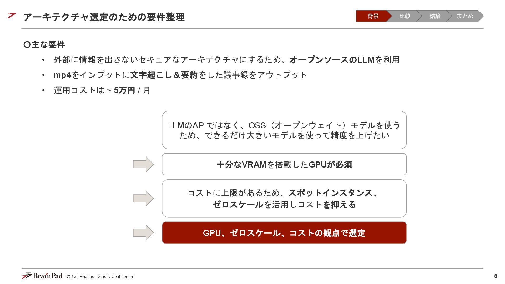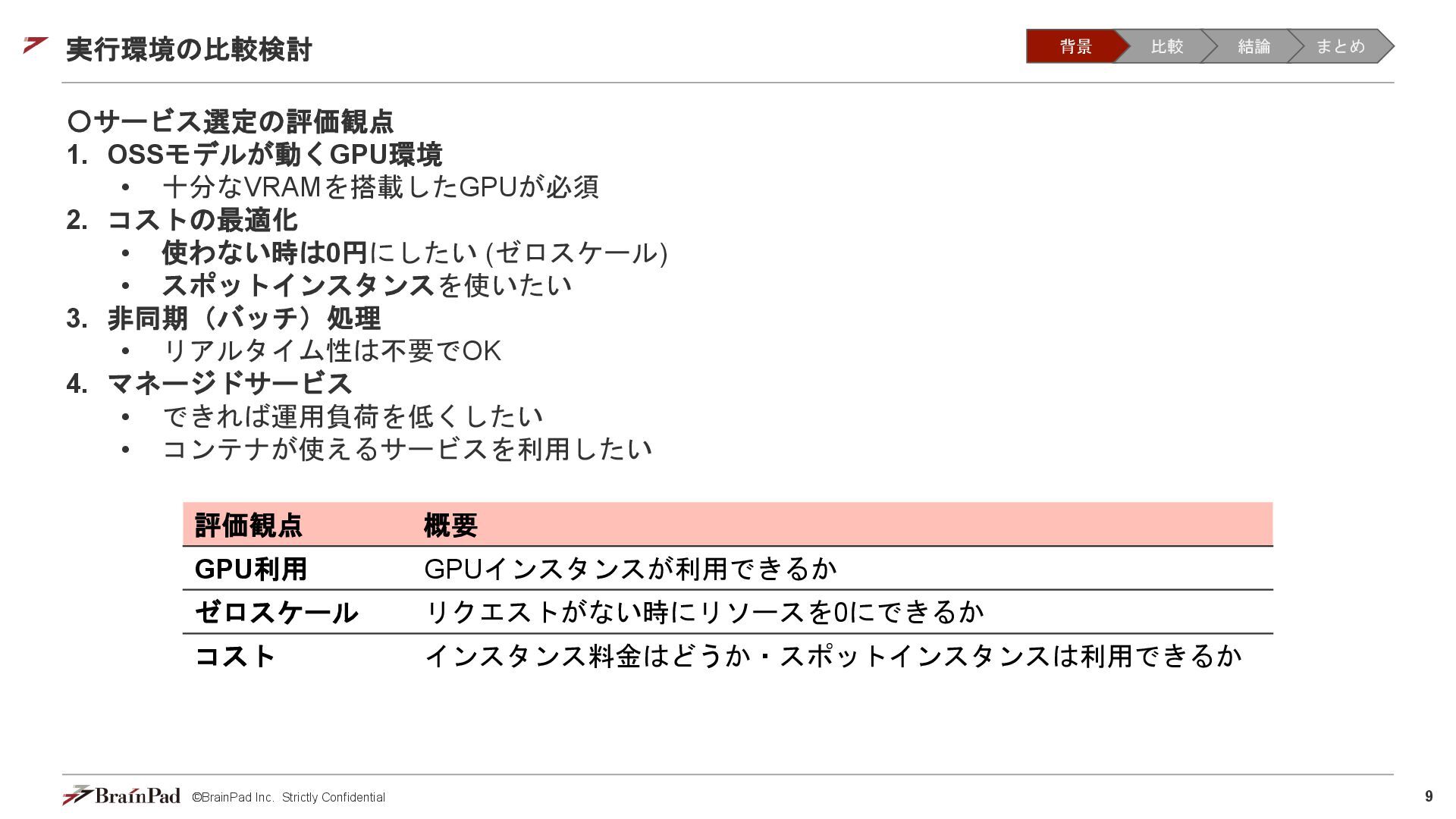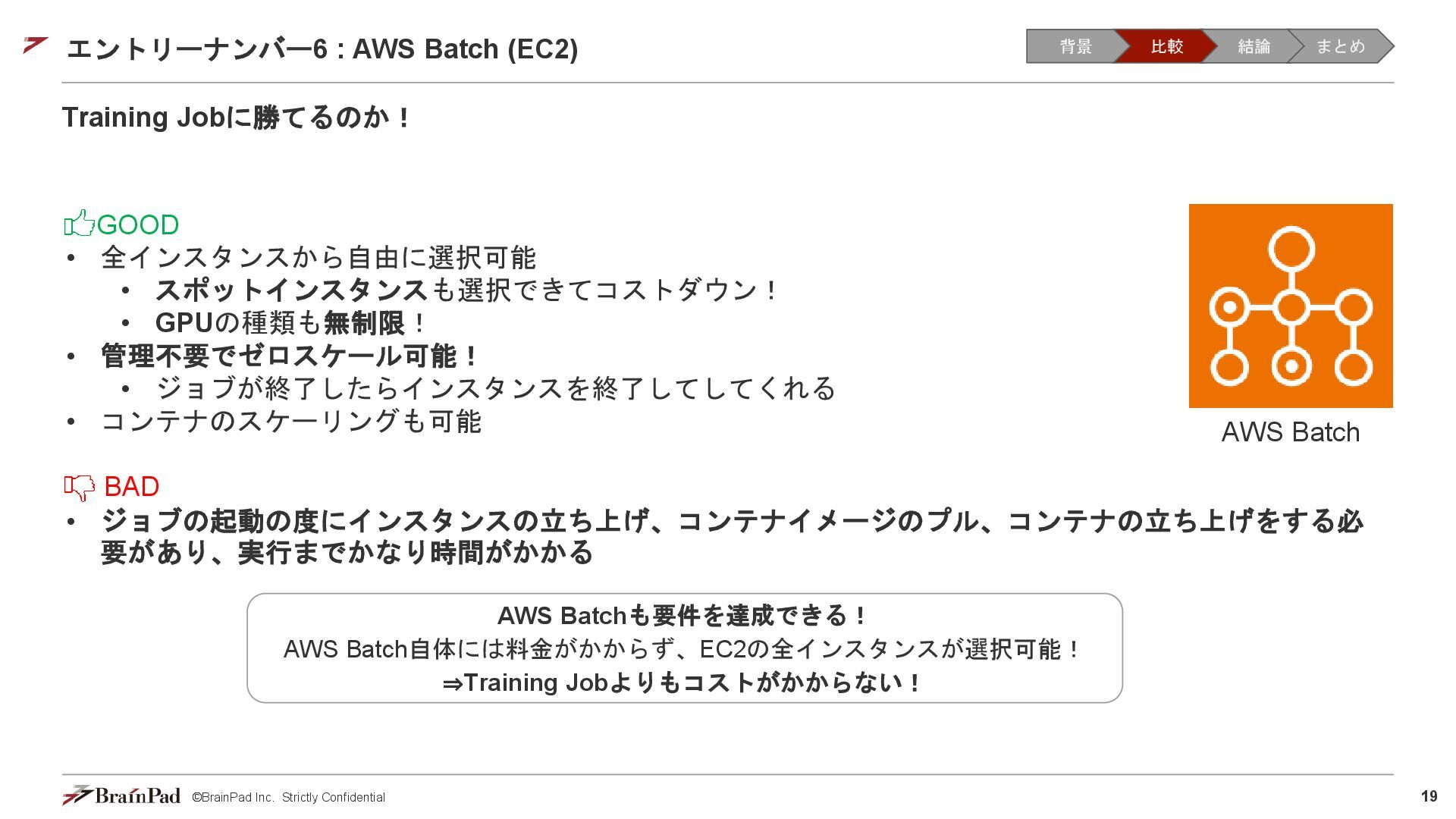 コストは試算で 4.5万 / 月に収まりました • 30 / 日リクエスト、20日 / 月とする。インスタンスが1.11 USD / 時 ⇒ 約4.5万円 • 一方で、処理時間(10分以内)の目標は未達(許容)でした。 【トレードオフ:実行速度】 • AWS Batchはジョブの都度、①EC2インスタンスの起動 ⇒ ②ECSクラスタの作成⇒ ③イメージのプル ⇒ ④コンテナ立ち上げ ⇒ ⑤コンテナ実行(⇒ ⑥インスタンスの終了)を行ため、非常に時間がかかる • 実際にかかった時間(LLMモデルで議事録を要約するコンテナ) • 起動に11分(①②③④) • 30分の動画に対する要約に14分(⑤) • 削除に5分程度(⑥) レスポンスまで25分 1リクエスト当たり30分のコスト 背景 比較 結論 まとめ