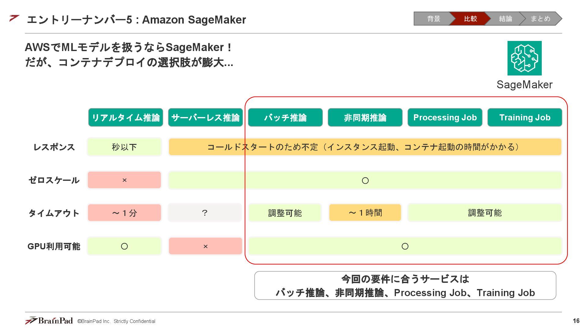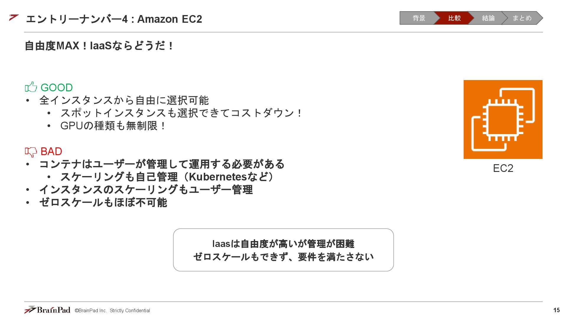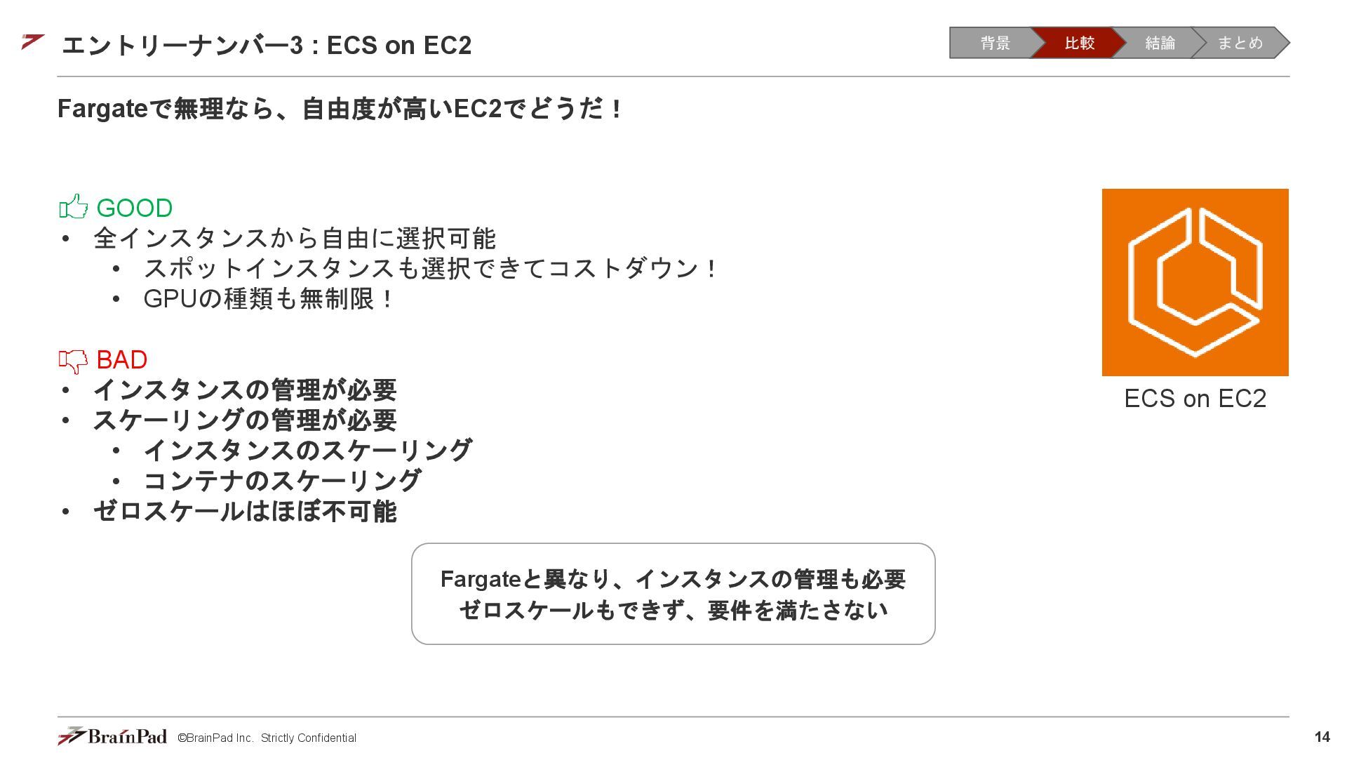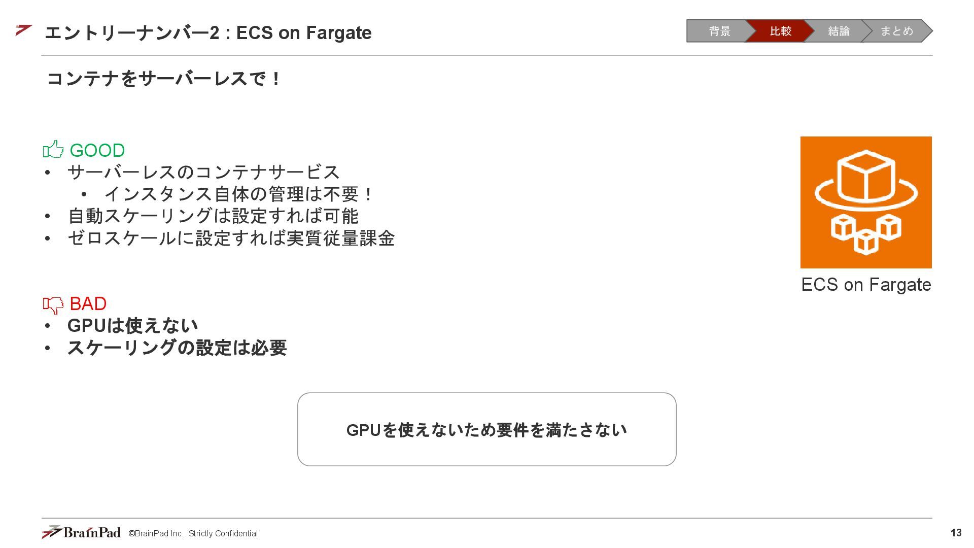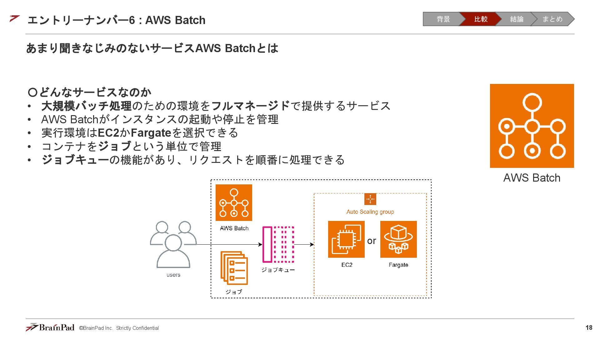 コストは試算で 4.5万 / 月に収まりました • 30 / 日リクエスト、20日 / 月とする。インスタンスが1.11 USD / 時 ⇒ 約4.5万円 • 一方で、処理時間(10分以内)の目標は未達(許容)でした。 【トレードオフ:実行速度】 • AWS Batchはジョブの都度、①EC2インスタンスの起動 ⇒ ②ECSクラスタの作成⇒ ③イメージのプル ⇒ ④コンテナ立ち上げ ⇒ ⑤コンテナ実行(⇒ ⑥インスタンスの終了)を行ため、非常に時間がかかる • 実際にかかった時間(LLMモデルで議事録を要約するコンテナ) • 起動に11分(①②③④) • 30分の動画に対する要約に14分(⑤) • 削除に5分程度(⑥) レスポンスまで25分 1リクエスト当たり30分のコスト 背景 比較 結論 まとめ