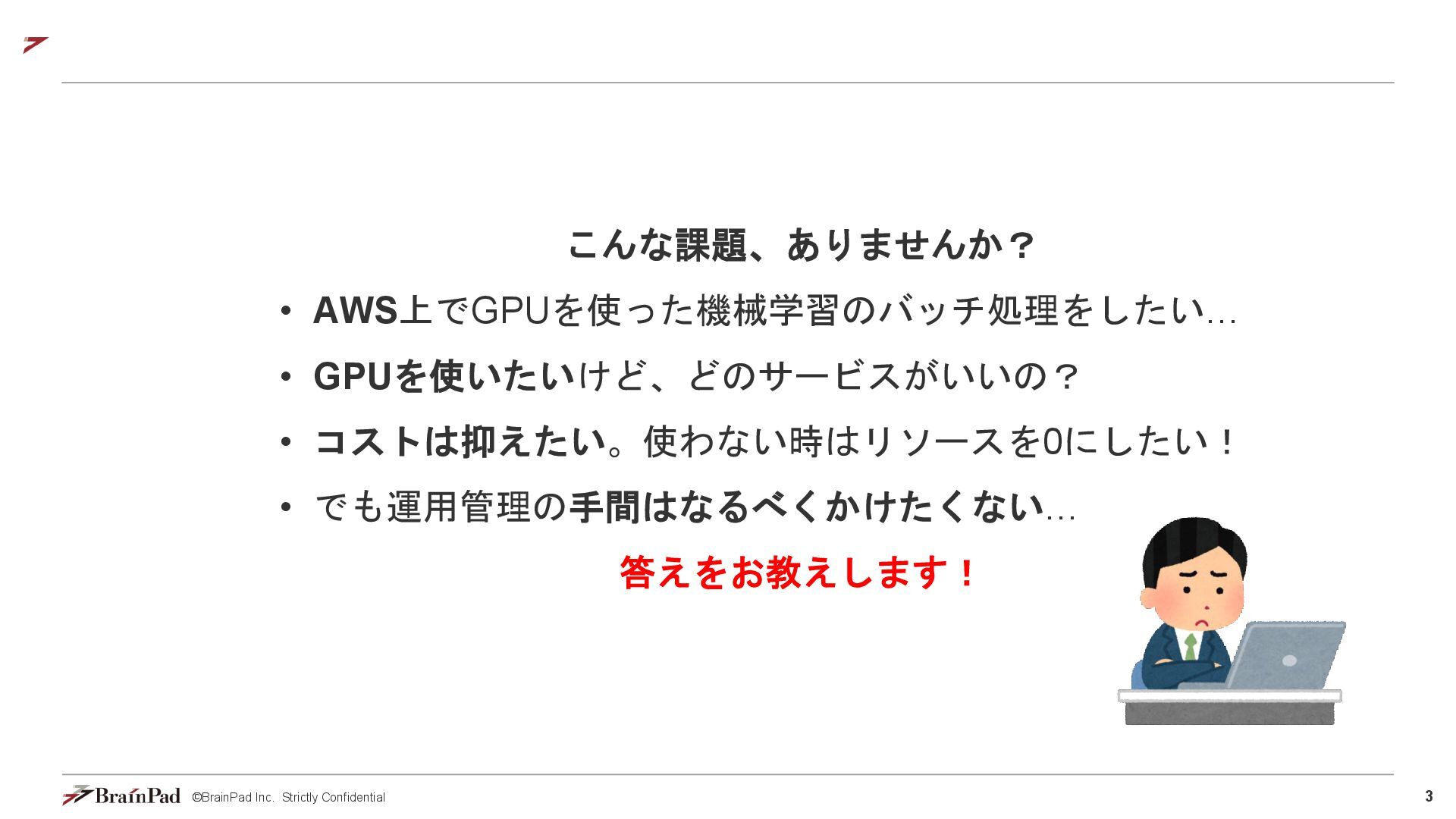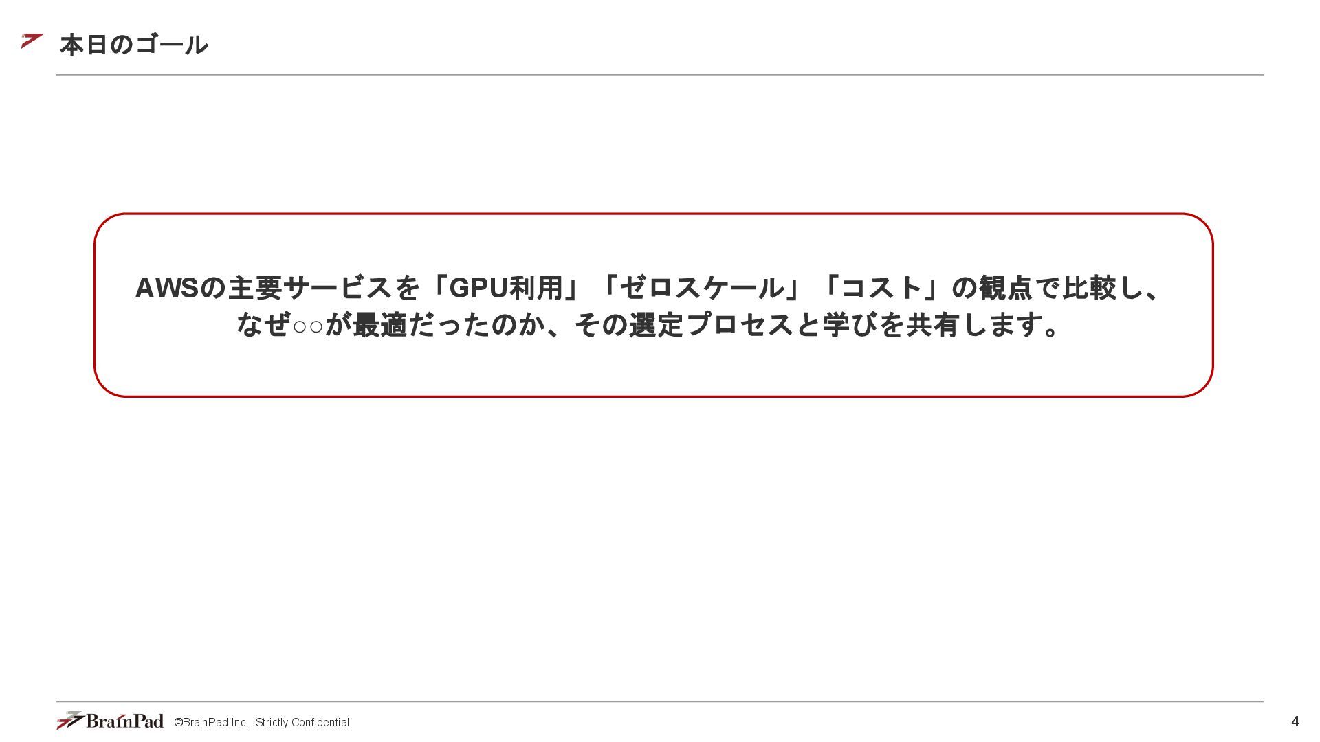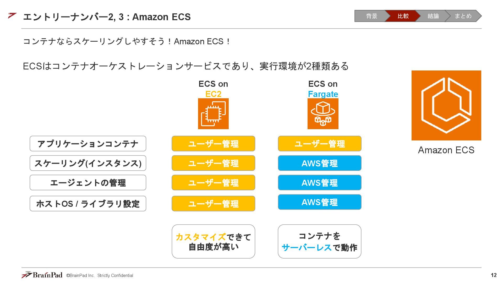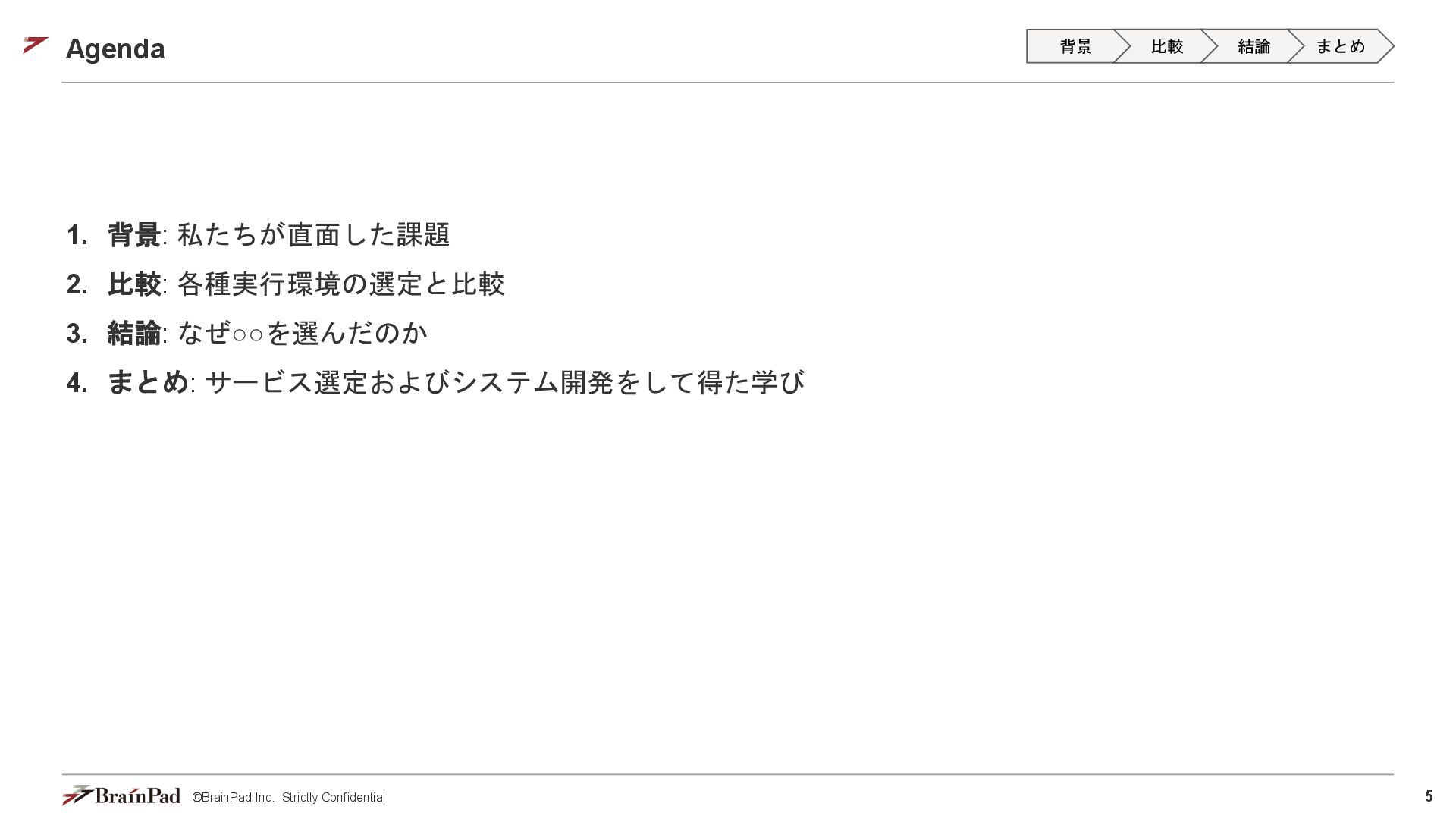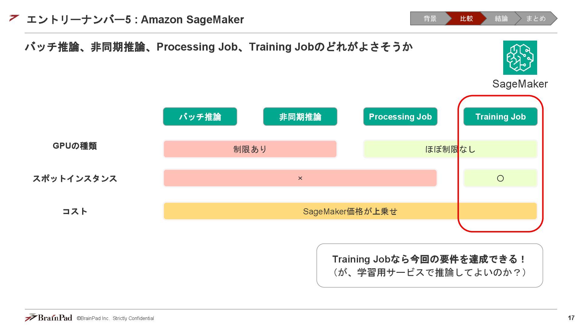 コストは試算で 4.5万 / 月に収まりました • 30 / 日リクエスト、20日 / 月とする。インスタンスが1.11 USD / 時 ⇒ 約4.5万円 • 一方で、処理時間(10分以内)の目標は未達(許容)でした。 【トレードオフ:実行速度】 • AWS Batchはジョブの都度、①EC2インスタンスの起動 ⇒ ②ECSクラスタの作成⇒ ③イメージのプル ⇒ ④コンテナ立ち上げ ⇒ ⑤コンテナ実行(⇒ ⑥インスタンスの終了)を行ため、非常に時間がかかる • 実際にかかった時間(LLMモデルで議事録を要約するコンテナ) • 起動に11分(①②③④) • 30分の動画に対する要約に14分(⑤) • 削除に5分程度(⑥) レスポンスまで25分 1リクエスト当たり30分のコスト 背景 比較 結論 まとめ