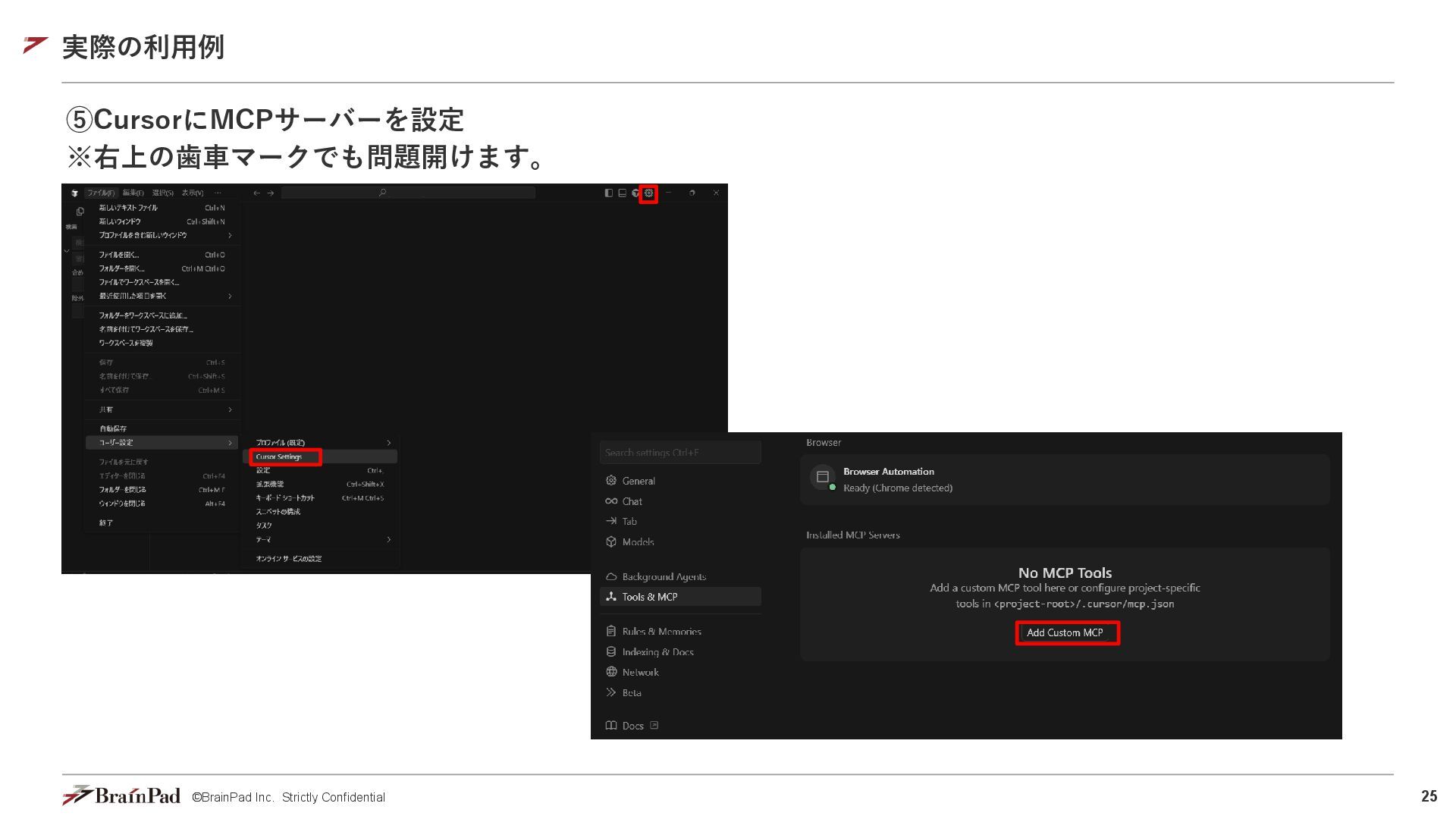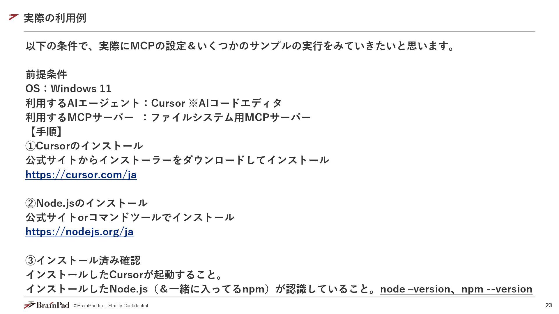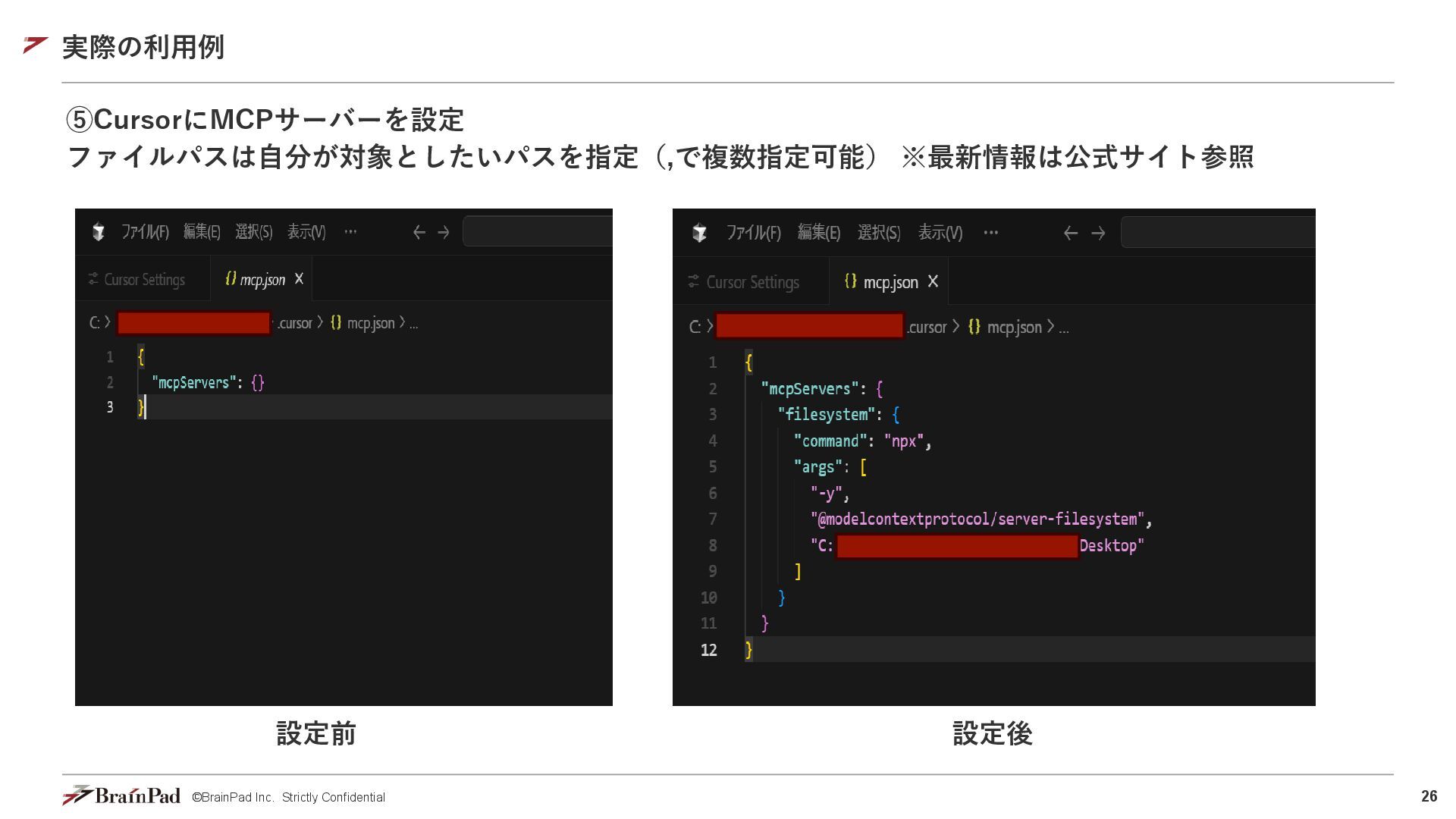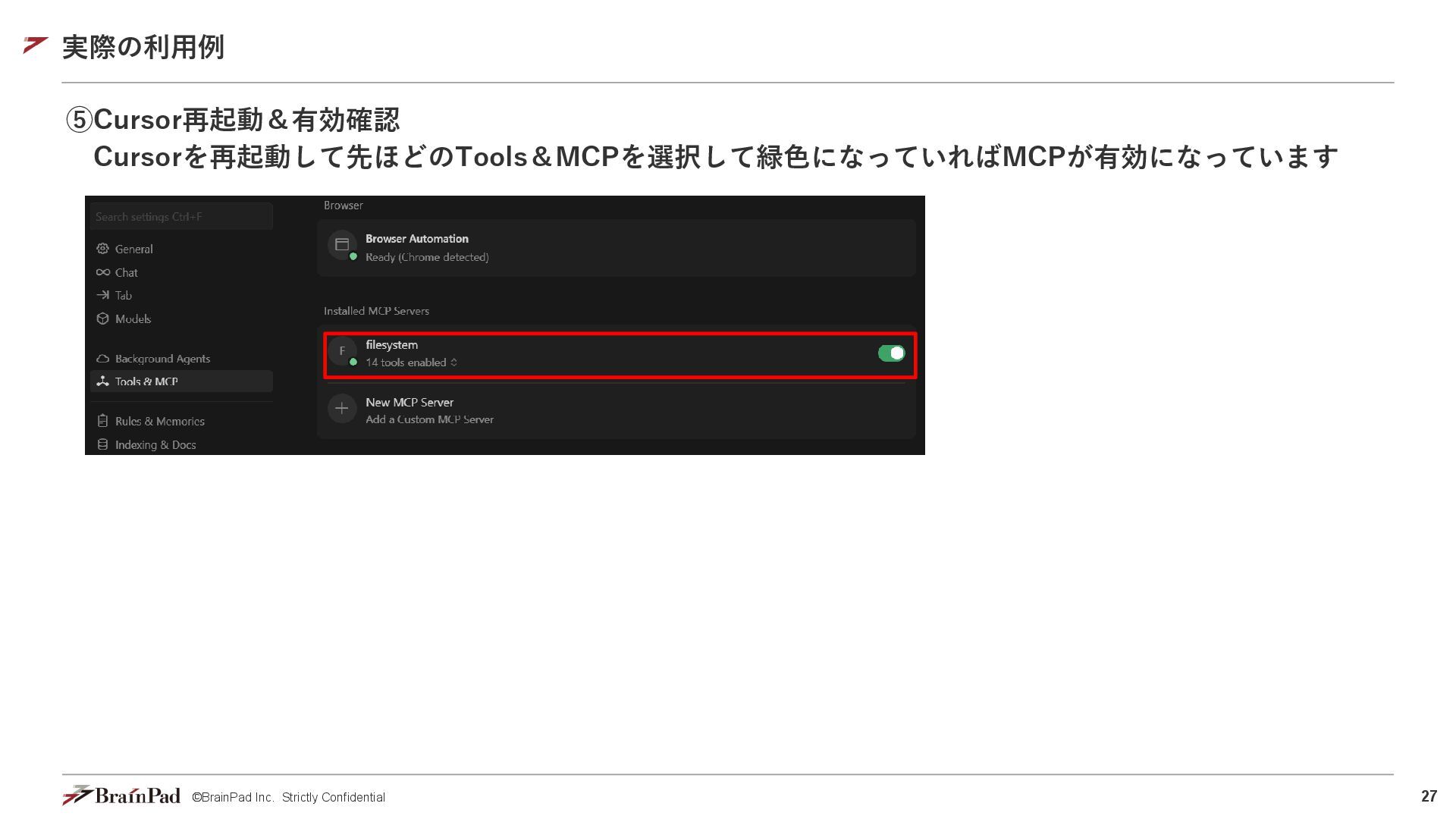 -g @modelcontextprotocol/server-filesystem ※ローカル環境ではなくリモート環境でMCPサーバーを実行することも可能です。 その場合は本手順は不要です。 ⑤CursorにMCPサーバーを設定 Cursorを起動して、メニューのファイル→ユーザー設定→Cursor Settings Tools&MCPを選択し、New MCP Serverをクリックして以下の値を設定 ------------------- { "mcpServers": { "filesystem": { "command": "npx", "args": [ "-y", "@modelcontextprotocol/server-filesystem", “【対象としたいディレクトリパス】"] } } }