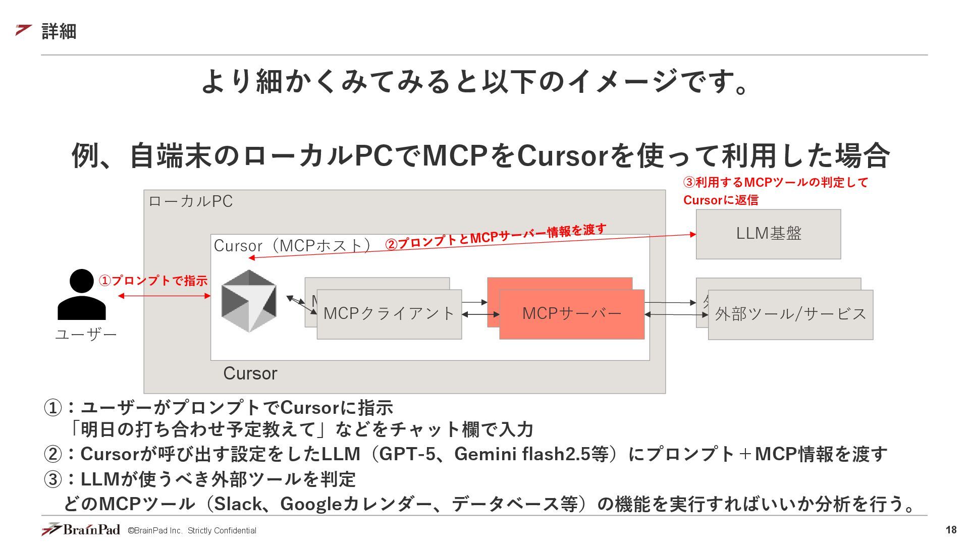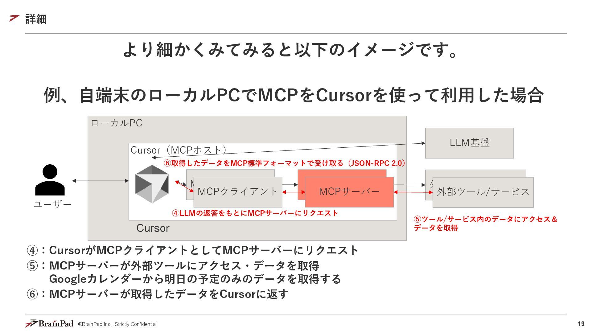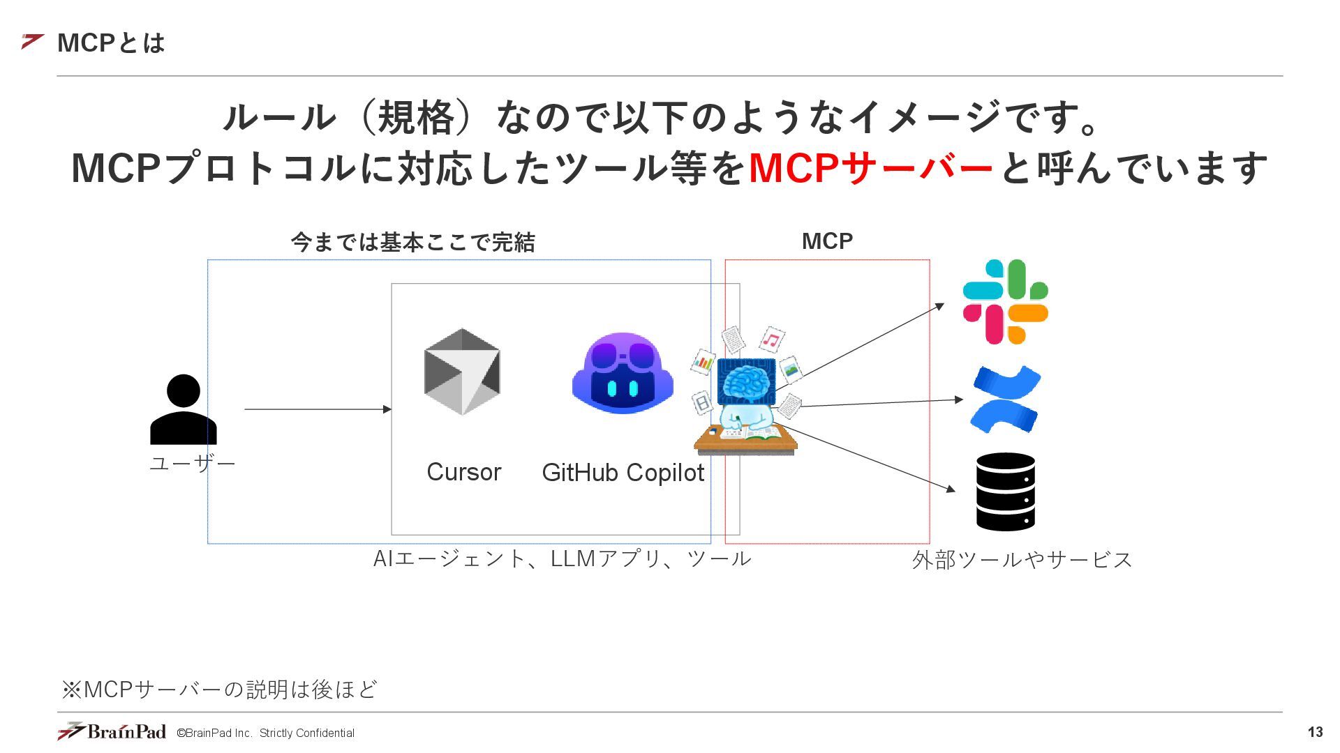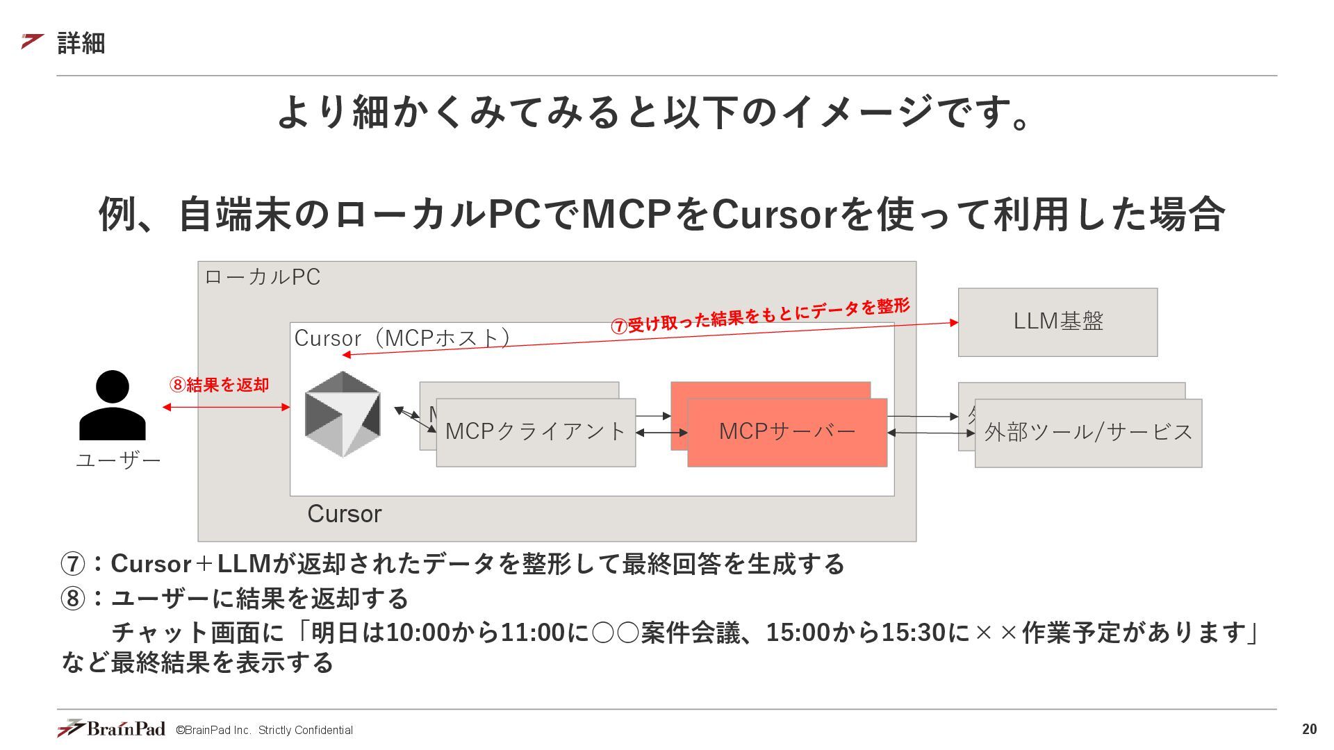 -g @modelcontextprotocol/server-filesystem ※ローカル環境ではなくリモート環境でMCPサーバーを実行することも可能です。 その場合は本手順は不要です。 ⑤CursorにMCPサーバーを設定 Cursorを起動して、メニューのファイル→ユーザー設定→Cursor Settings Tools&MCPを選択し、New MCP Serverをクリックして以下の値を設定 ------------------- { "mcpServers": { "filesystem": { "command": "npx", "args": [ "-y", "@modelcontextprotocol/server-filesystem", “【対象としたいディレクトリパス】"] } } }