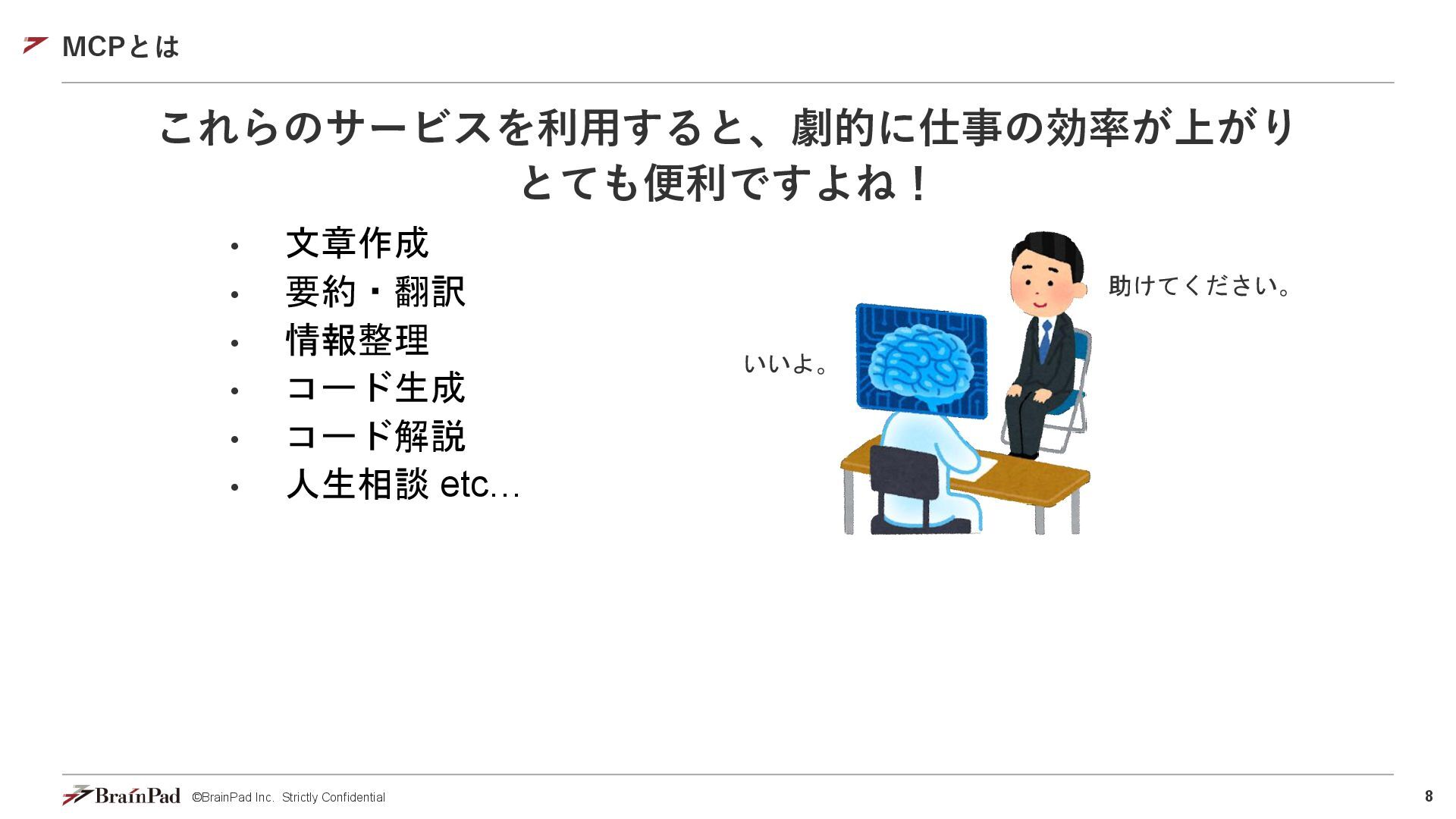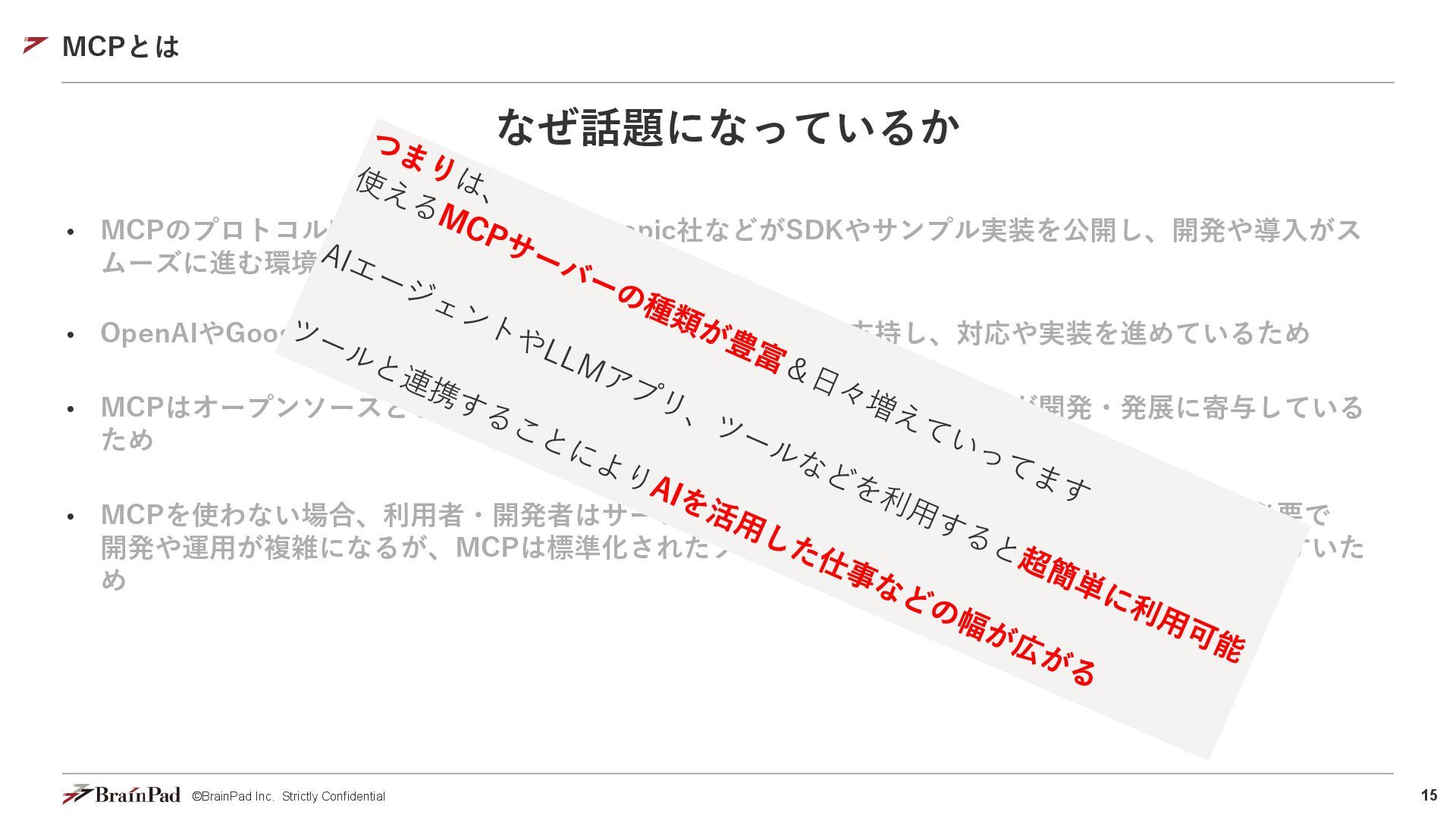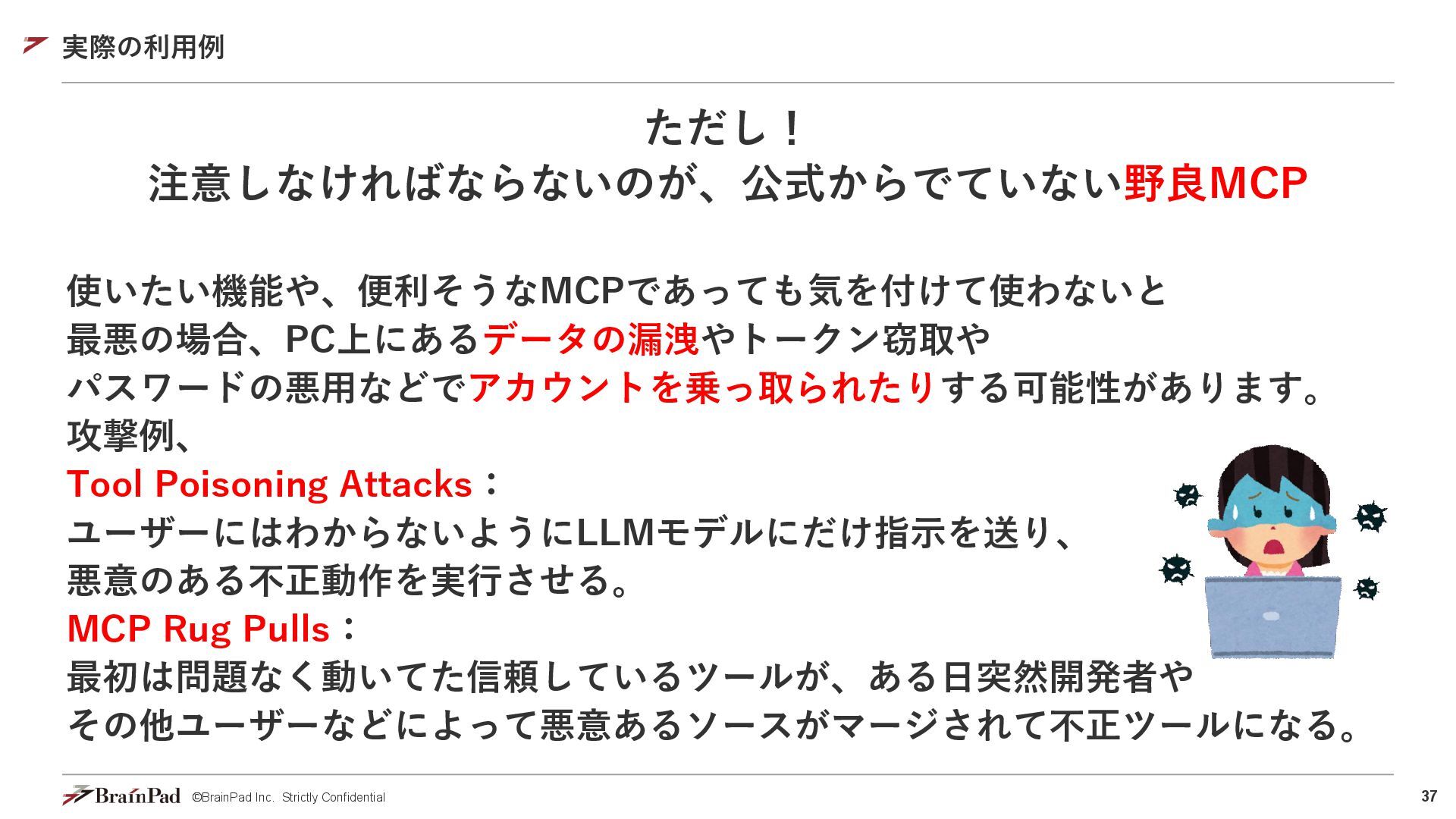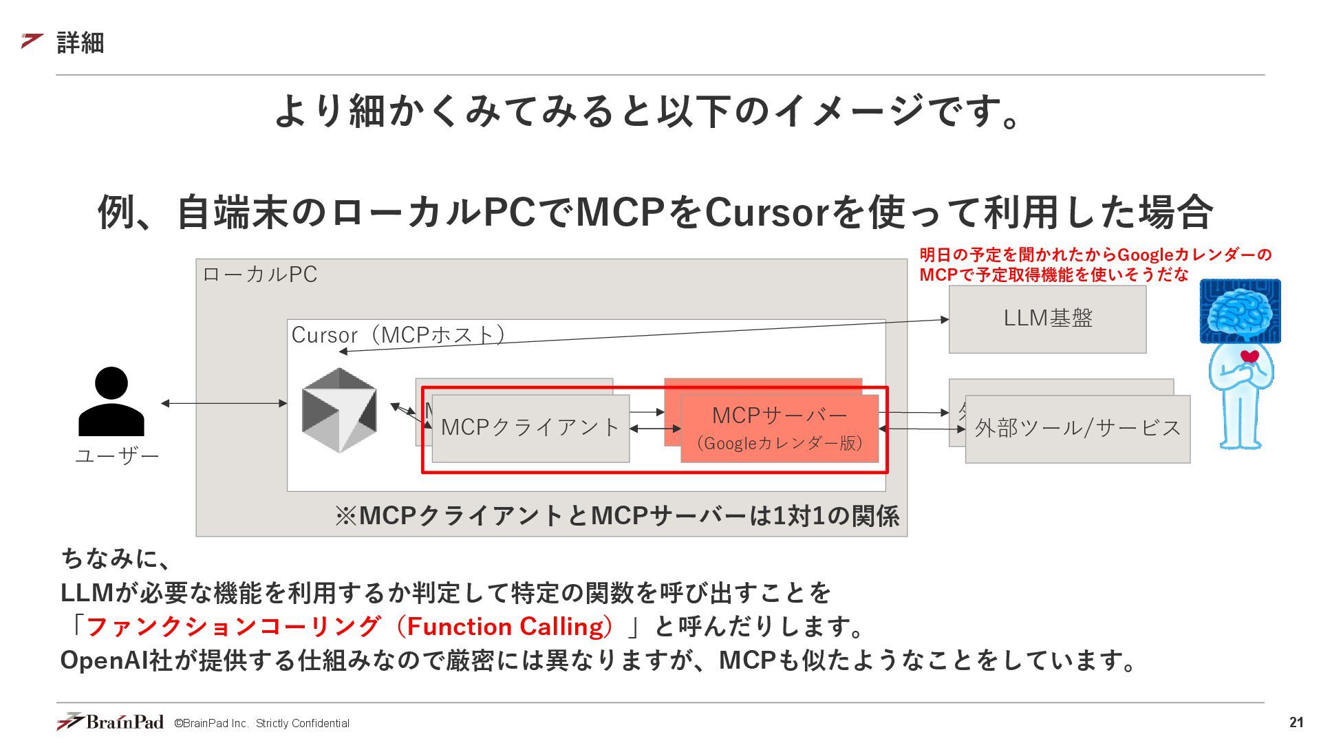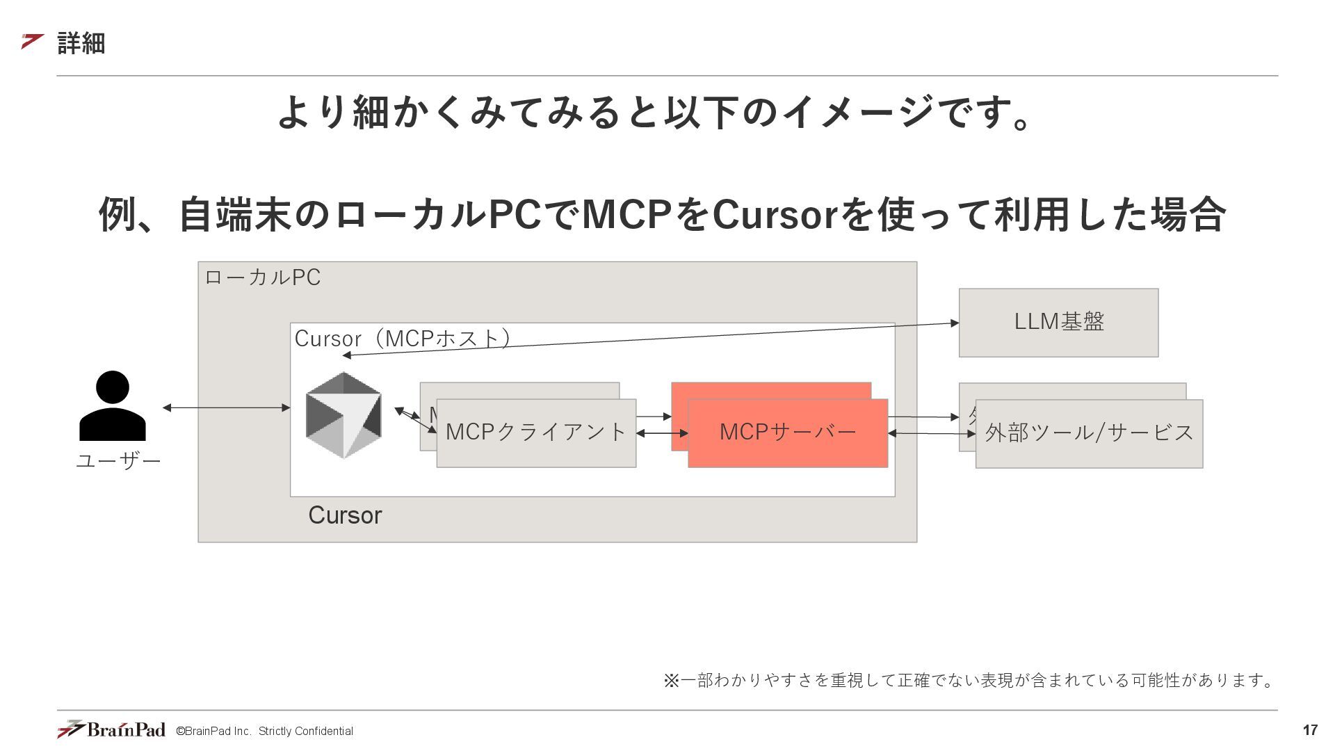 -g @modelcontextprotocol/server-filesystem ※ローカル環境ではなくリモート環境でMCPサーバーを実行することも可能です。 その場合は本手順は不要です。 ⑤CursorにMCPサーバーを設定 Cursorを起動して、メニューのファイル→ユーザー設定→Cursor Settings Tools&MCPを選択し、New MCP Serverをクリックして以下の値を設定 ------------------- { "mcpServers": { "filesystem": { "command": "npx", "args": [ "-y", "@modelcontextprotocol/server-filesystem", “【対象としたいディレクトリパス】"] } } }