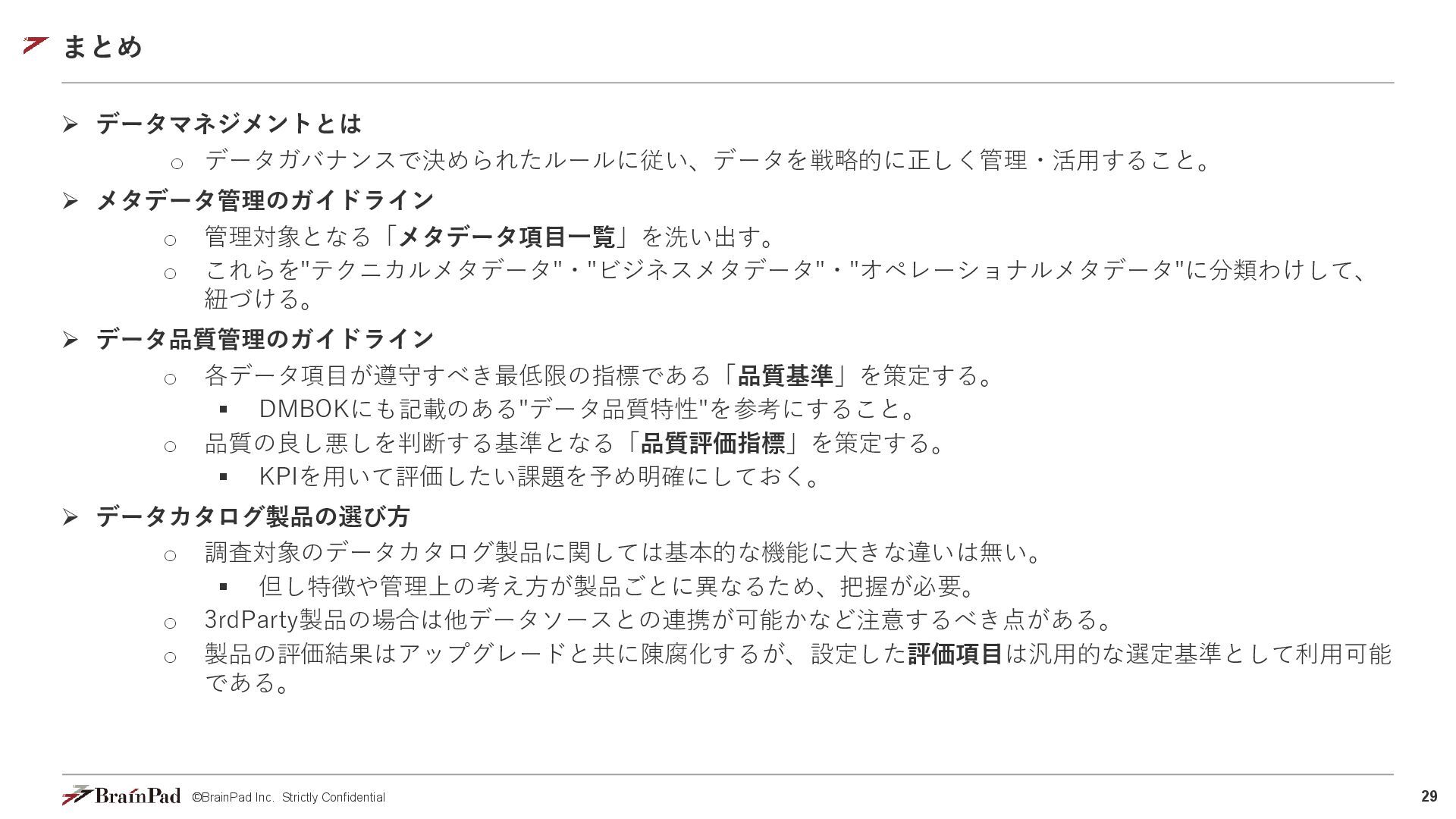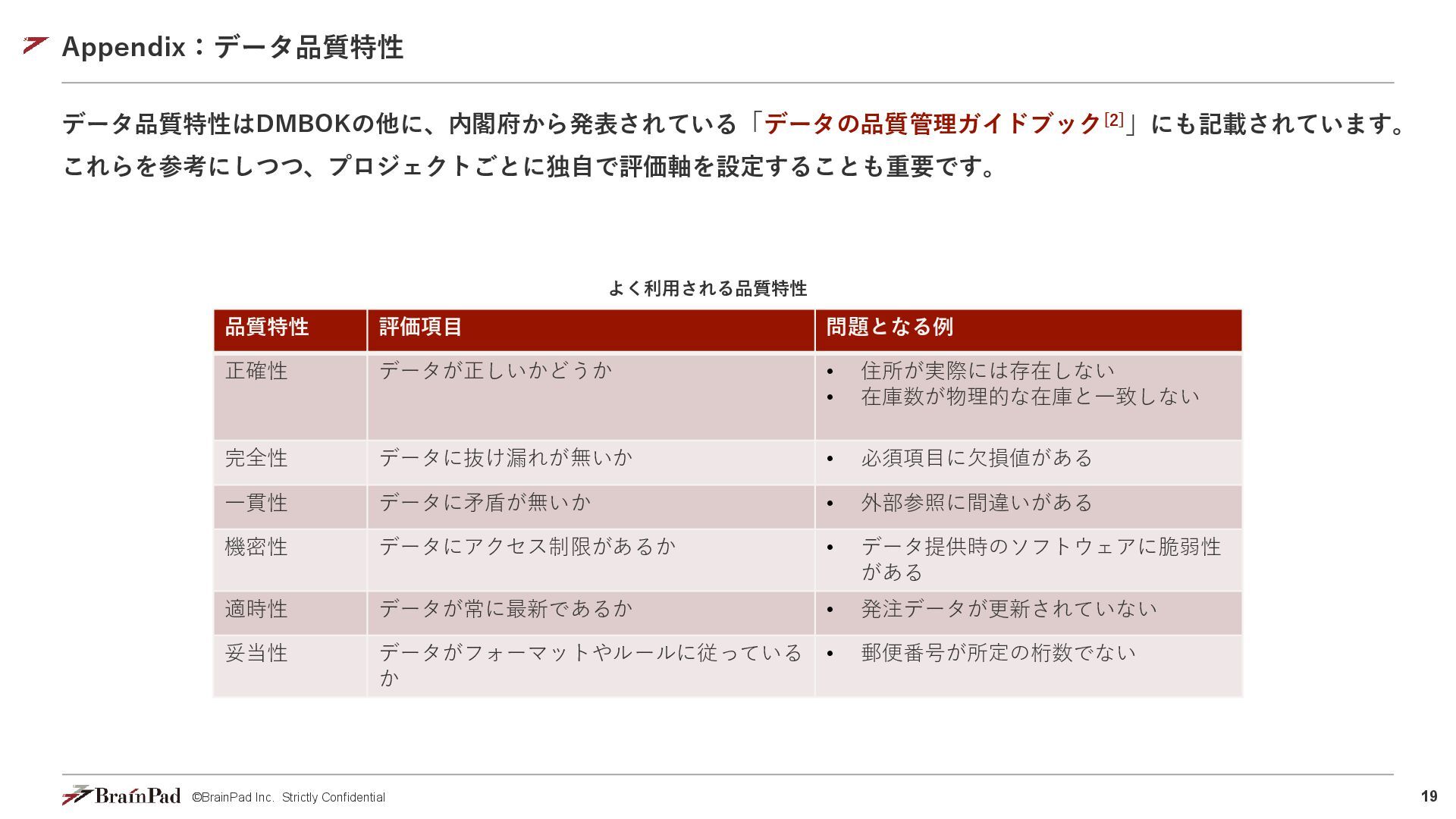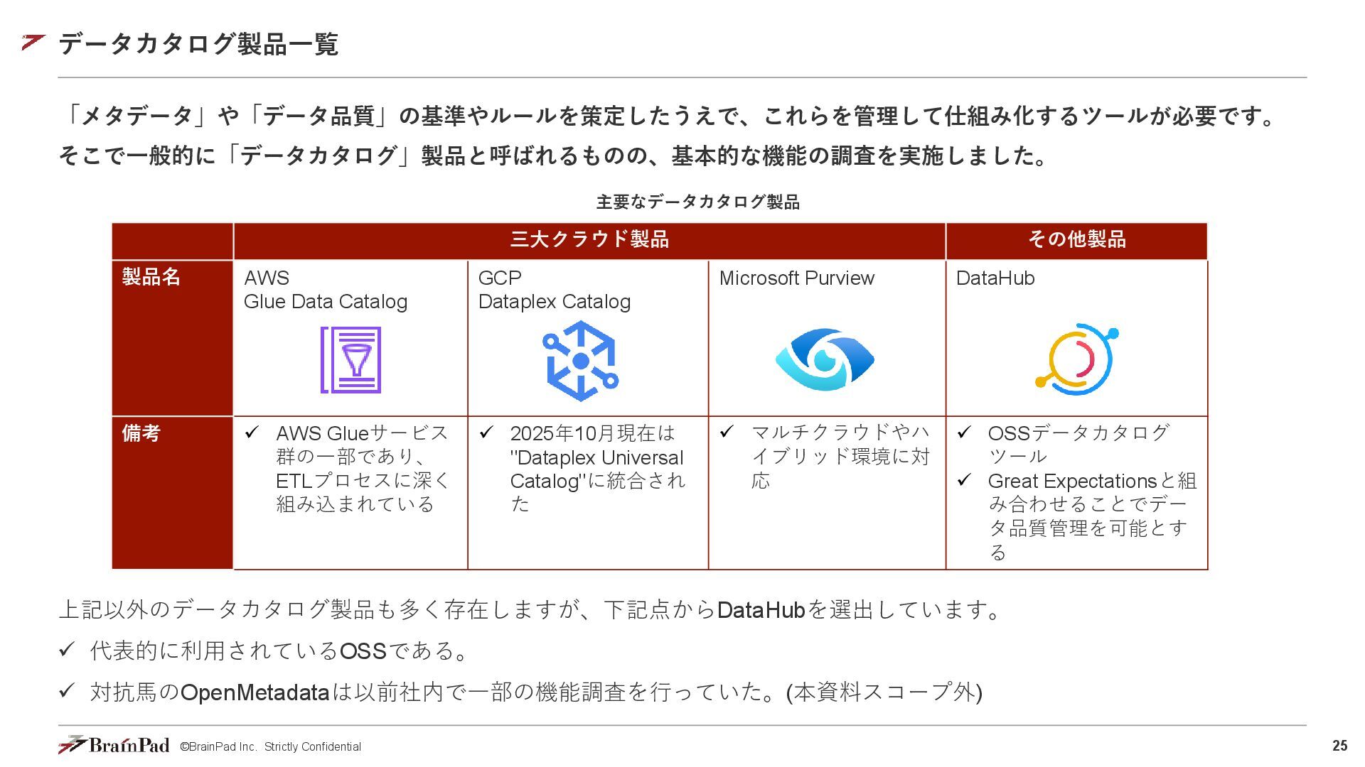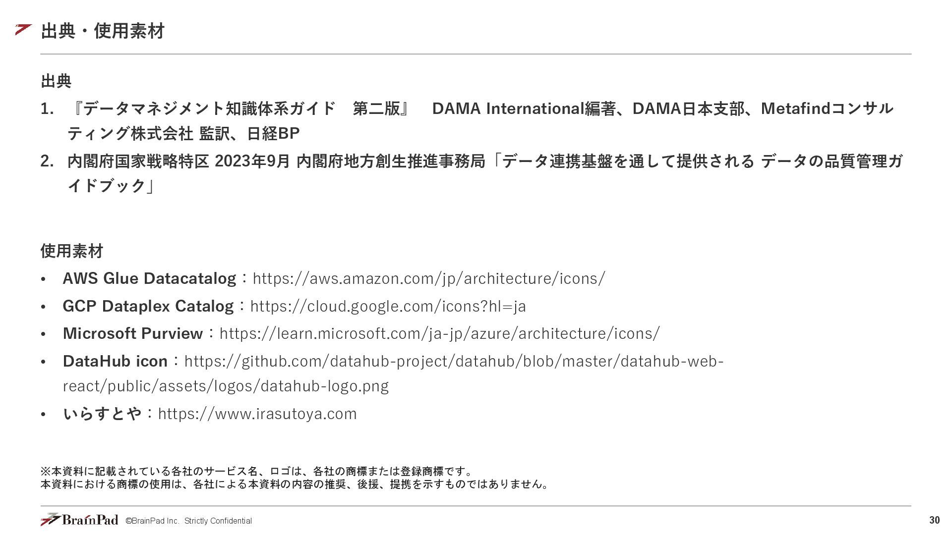 International編著、DAMA日本支部、Metafindコンサル ティング株式会社 監訳、日経BP 2. 内閣府国家戦略特区 2023年9月 内閣府地方創生推進事務局「データ連携基盤を通して提供される データの品質管理ガ イドブック」 出典・使用素材 使用素材 • AWS Glue Datacatalog:https://aws.amazon.com/jp/architecture/icons/ • GCP Dataplex Catalog:https://cloud.google.com/icons?hl=ja • Microsoft Purview:https://learn.microsoft.com/ja-jp/azure/architecture/icons/ • DataHub icon:https://github.com/datahub-project/datahub/blob/master/datahub-web- react/public/assets/logos/datahub-logo.png • いらすとや:https://www.irasutoya.com ※本資料に記載されている各社のサービス名、ロゴは、各社の商標または登録商標です。 本資料における商標の使用は、各社による本資料の内容の推奨、後援、提携を示すものではありません。