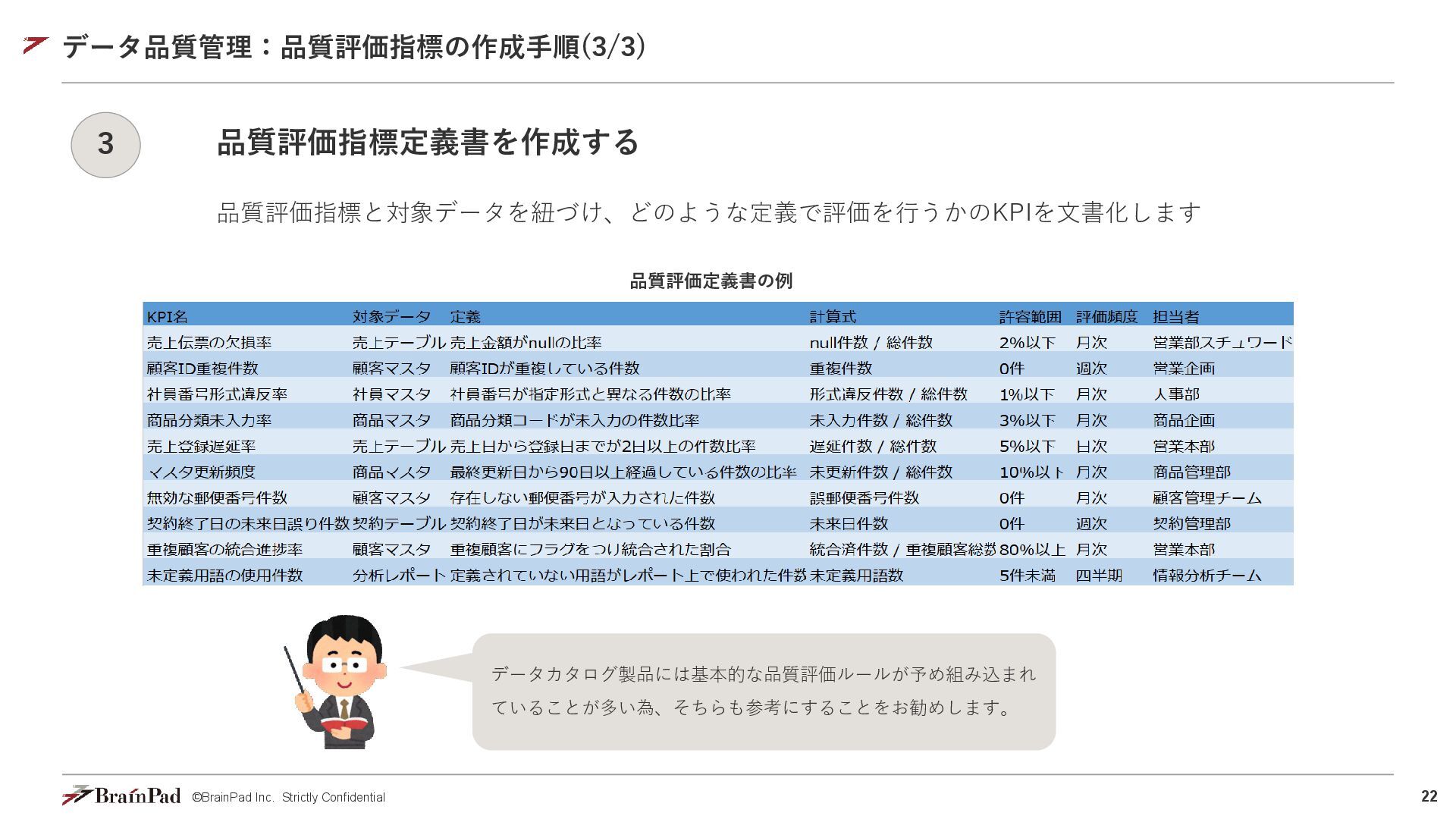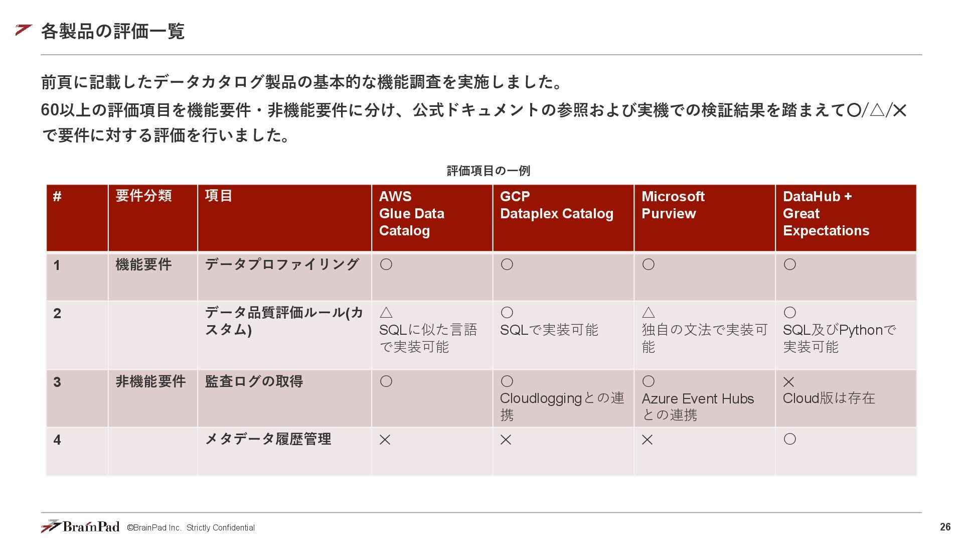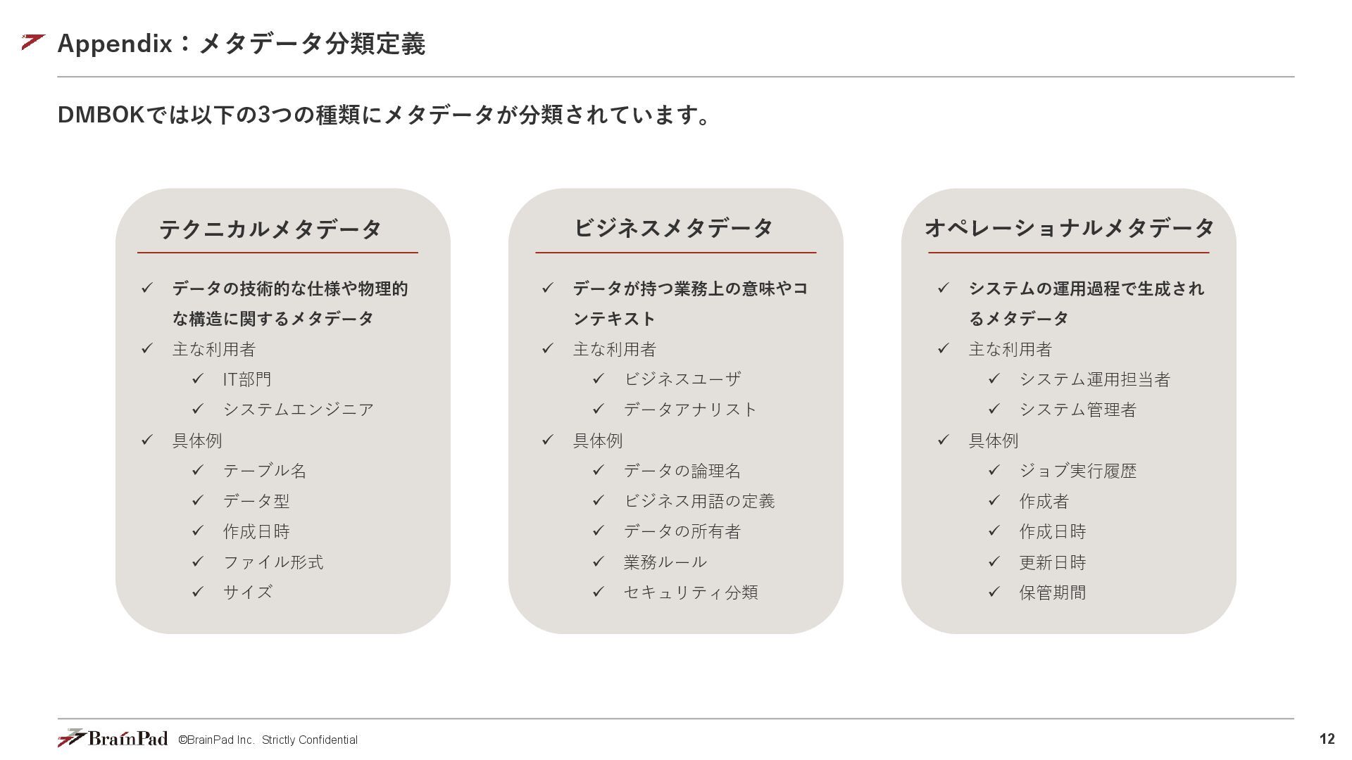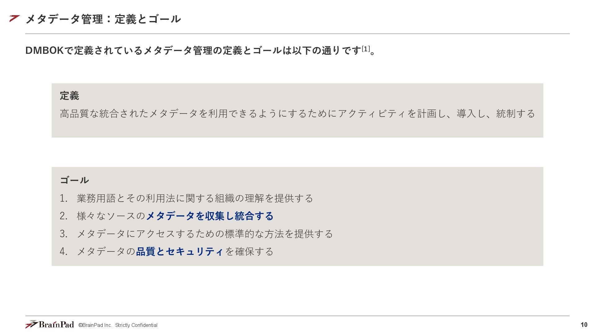International編著、DAMA日本支部、Metafindコンサル ティング株式会社 監訳、日経BP 2. 内閣府国家戦略特区 2023年9月 内閣府地方創生推進事務局「データ連携基盤を通して提供される データの品質管理ガ イドブック」 出典・使用素材 使用素材 • AWS Glue Datacatalog:https://aws.amazon.com/jp/architecture/icons/ • GCP Dataplex Catalog:https://cloud.google.com/icons?hl=ja • Microsoft Purview:https://learn.microsoft.com/ja-jp/azure/architecture/icons/ • DataHub icon:https://github.com/datahub-project/datahub/blob/master/datahub-web- react/public/assets/logos/datahub-logo.png • いらすとや:https://www.irasutoya.com ※本資料に記載されている各社のサービス名、ロゴは、各社の商標または登録商標です。 本資料における商標の使用は、各社による本資料の内容の推奨、後援、提携を示すものではありません。