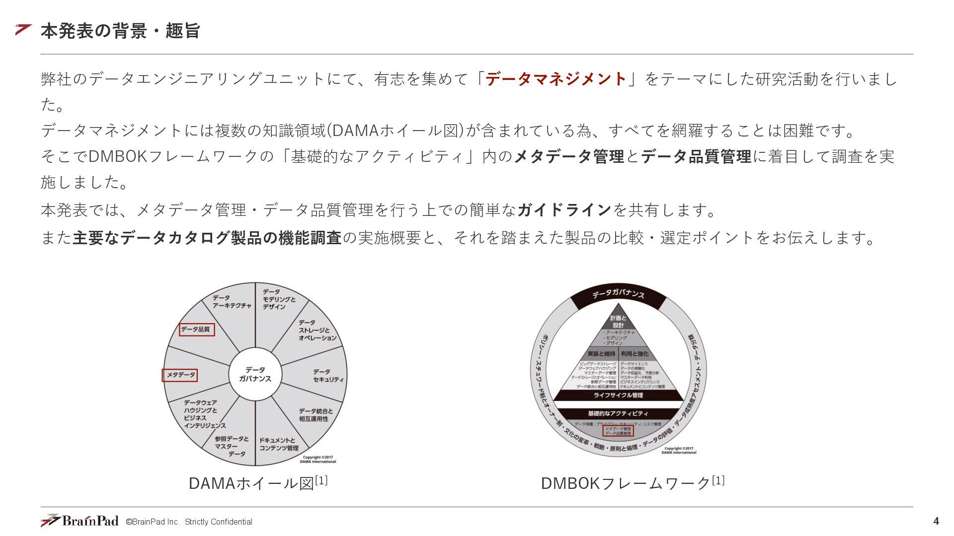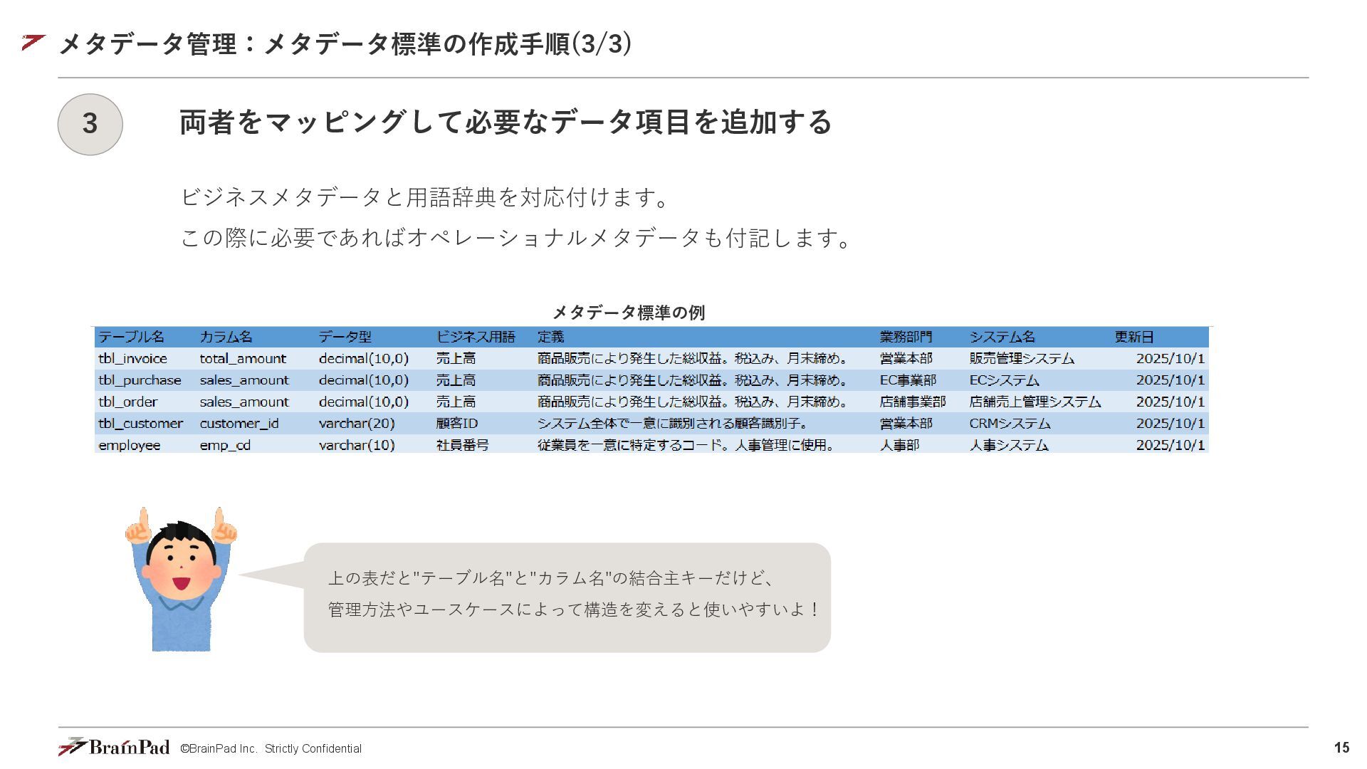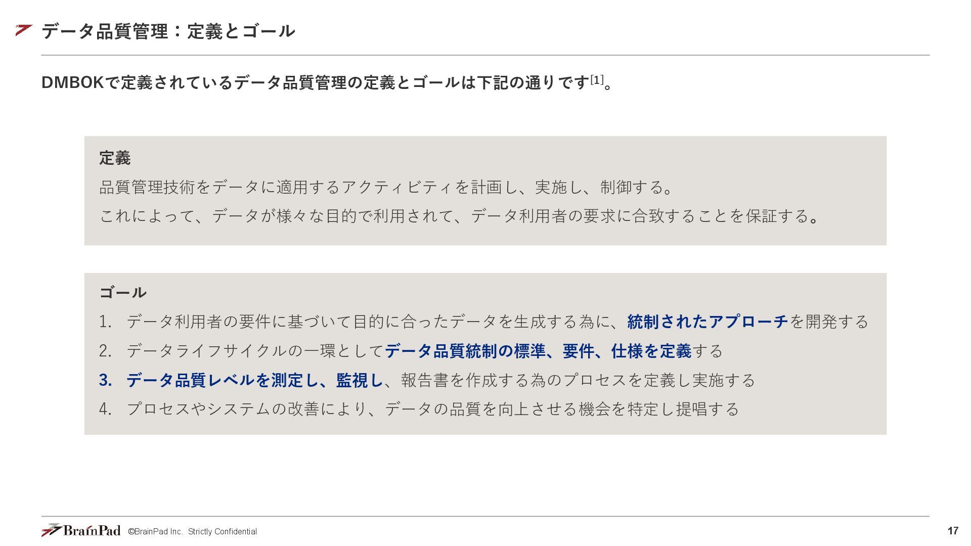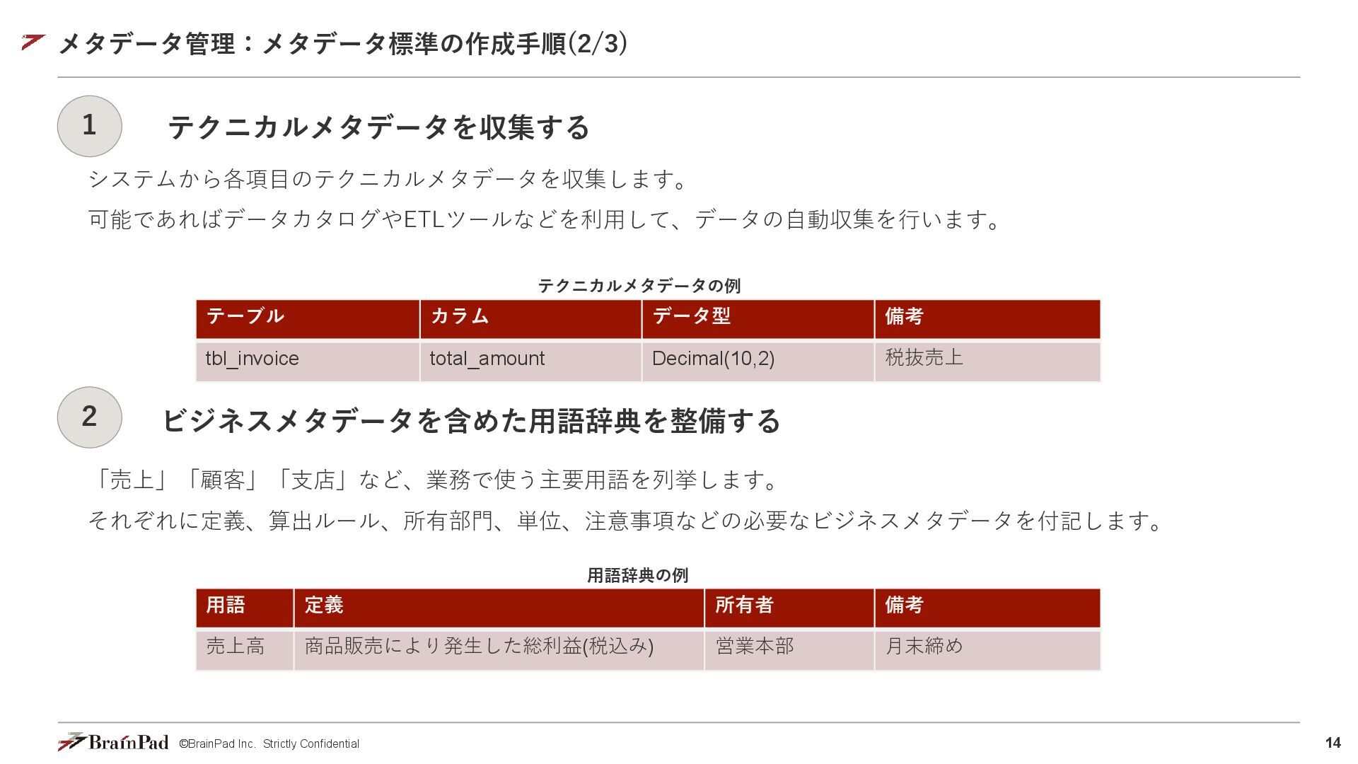 International編著、DAMA日本支部、Metafindコンサル ティング株式会社 監訳、日経BP 2. 内閣府国家戦略特区 2023年9月 内閣府地方創生推進事務局「データ連携基盤を通して提供される データの品質管理ガ イドブック」 出典・使用素材 使用素材 • AWS Glue Datacatalog:https://aws.amazon.com/jp/architecture/icons/ • GCP Dataplex Catalog:https://cloud.google.com/icons?hl=ja • Microsoft Purview:https://learn.microsoft.com/ja-jp/azure/architecture/icons/ • DataHub icon:https://github.com/datahub-project/datahub/blob/master/datahub-web- react/public/assets/logos/datahub-logo.png • いらすとや:https://www.irasutoya.com ※本資料に記載されている各社のサービス名、ロゴは、各社の商標または登録商標です。 本資料における商標の使用は、各社による本資料の内容の推奨、後援、提携を示すものではありません。