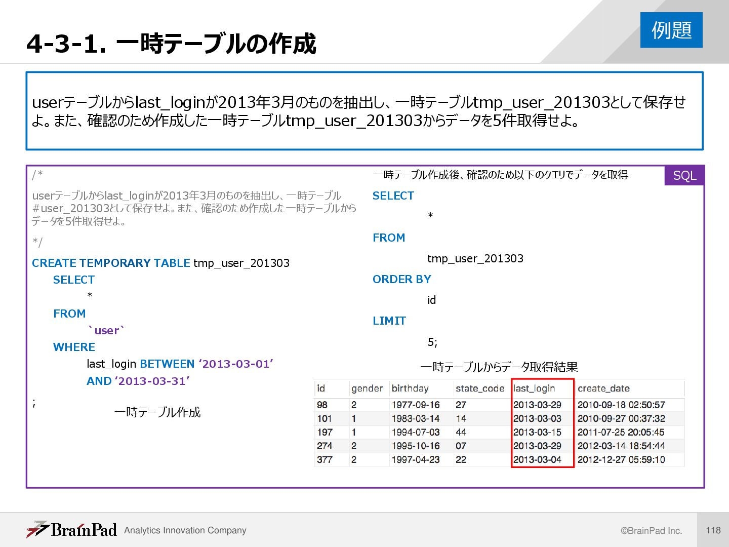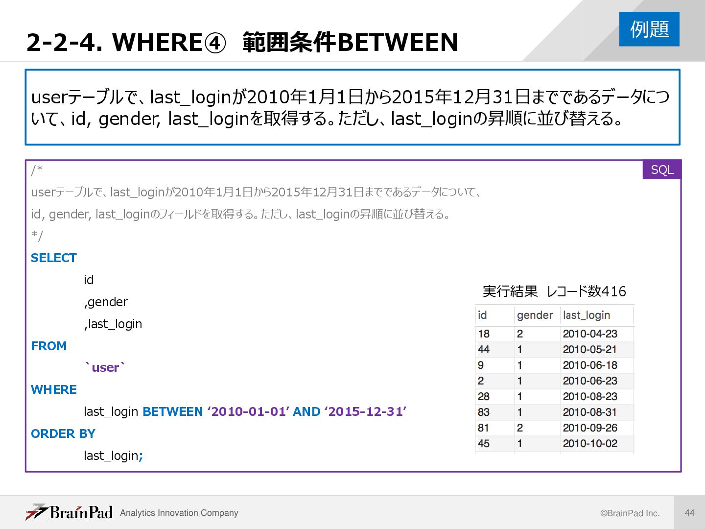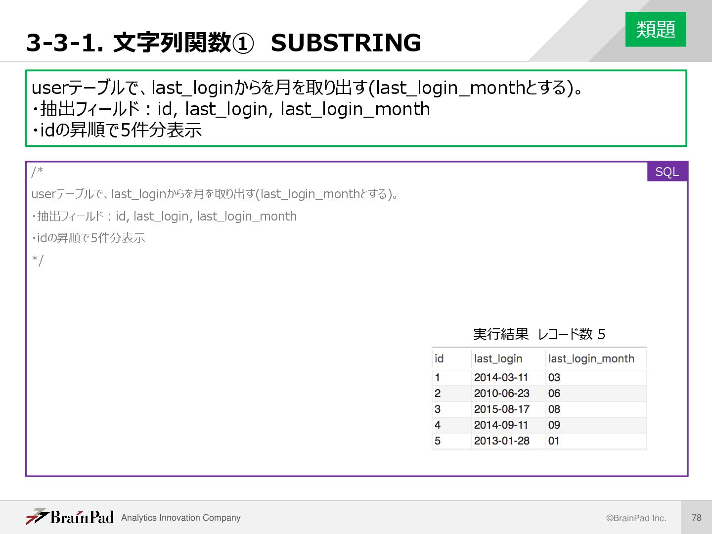 1. REPLACE(日付, ‘-’, ‘’) 現在日付と誕生日について、yyyy-mm-dd形式のハイフン’-’ を空文字’’に置換し、yyyymmdd形式に直す 2. CAST(yyyymmdd AS UNSIGNED) 整数型(INTEGER)に変換 3. 差をとって10000で割り、小数部分切り捨て 切り捨てはTRUNCATE(数値 , 0) 例. 現在日付2018-04-24, 誕生日1995-06-21 (20180424 – 19950621) / 10000 =22.98 → 22歳 ※この方法でなぜ年齢を求めることができるのかについては、各自 調べてください(年齢を求めるAGE関数がサポートされているDB製 品もあります) 解説 /* userテーブルのbirthdayから、現在の日付におけ るユーザーの年齢を求める。 ・抽出フィールド:id, current_date, birthday, age ・idの昇順で5件分表示 */ SELECT id ,CURRENT_DATE AS `current_date` ,birthday ,TRUNCATE( (CAST(REPLACE(CURRENT_DATE, ‘-’, ‘’) AS UNSIGNED) - CAST(REPLACE(birthday, ‘-’, ‘’)AS UNSIGNED)) / 10000, 0) AS `age` …以下省略 SQL