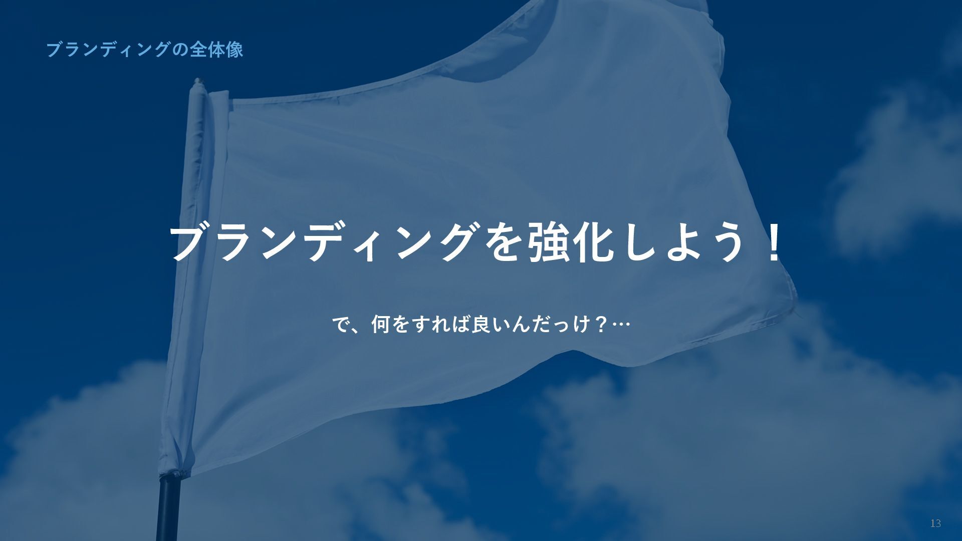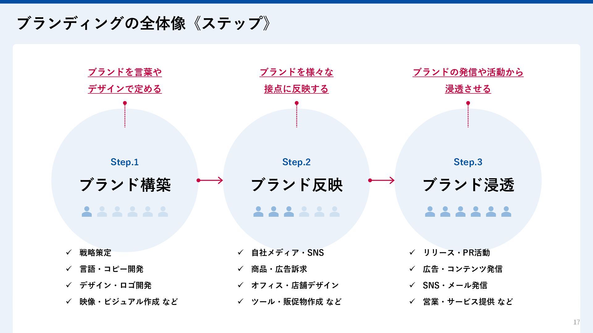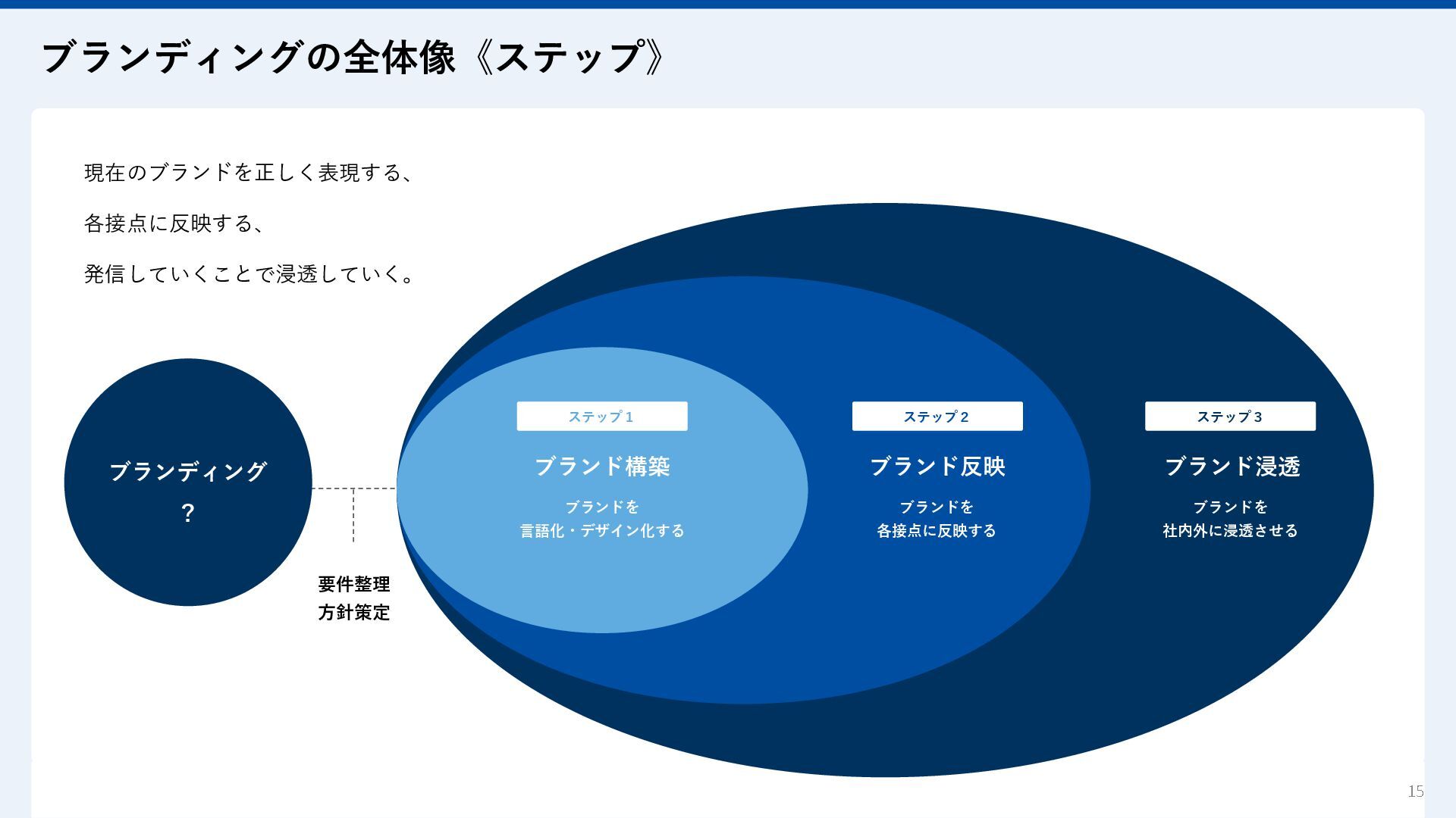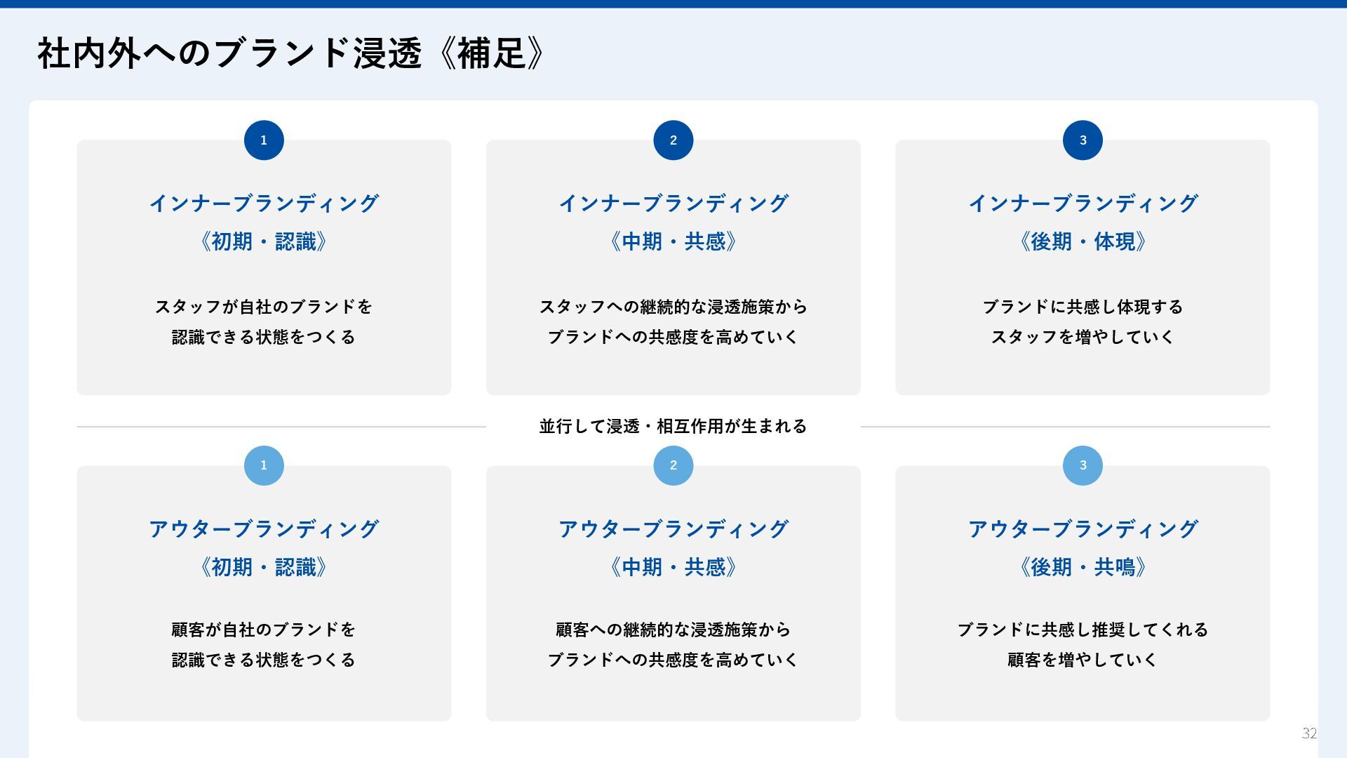 認識できる状態をつくる インナーブランディング 《初期・認識》 1 スタッフへの継続的な浸透施策から ブランドへの共感度を高めていく インナーブランディング 《中期・共感》 2 ブランドに共感し体現する スタッフを増やしていく インナーブランディング 《後期・体現》 3 顧客が自社のブランドを 認識できる状態をつくる アウターブランディング 《初期・認識》 1 顧客への継続的な浸透施策から ブランドへの共感度を高めていく アウターブランディング 《中期・共感》 2 ブランドに共感し推奨してくれる 顧客を増やしていく アウターブランディング 《後期・共鳴》 3 並行して浸透・相互作用が生まれる