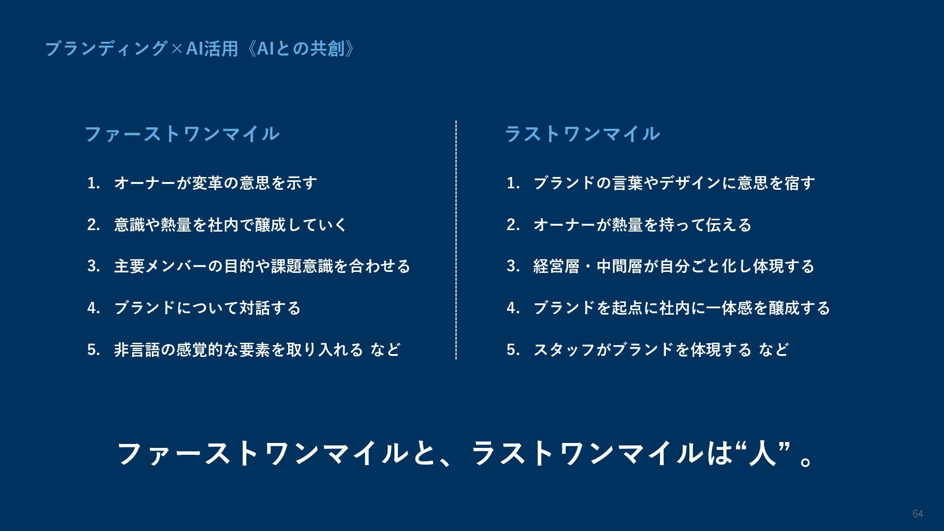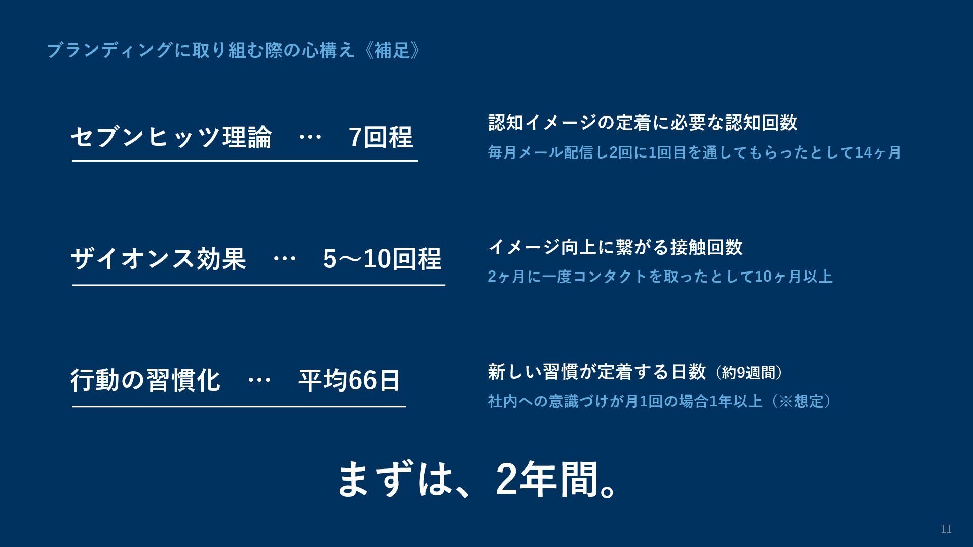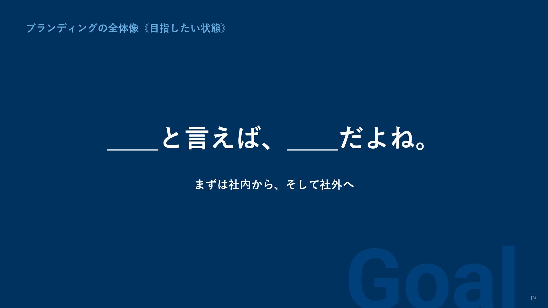認識できる状態をつくる インナーブランディング 《初期・認識》 1 スタッフへの継続的な浸透施策から ブランドへの共感度を高めていく インナーブランディング 《中期・共感》 2 ブランドに共感し体現する スタッフを増やしていく インナーブランディング 《後期・体現》 3 顧客が自社のブランドを 認識できる状態をつくる アウターブランディング 《初期・認識》 1 顧客への継続的な浸透施策から ブランドへの共感度を高めていく アウターブランディング 《中期・共感》 2 ブランドに共感し推奨してくれる 顧客を増やしていく アウターブランディング 《後期・共鳴》 3 並行して浸透・相互作用が生まれる