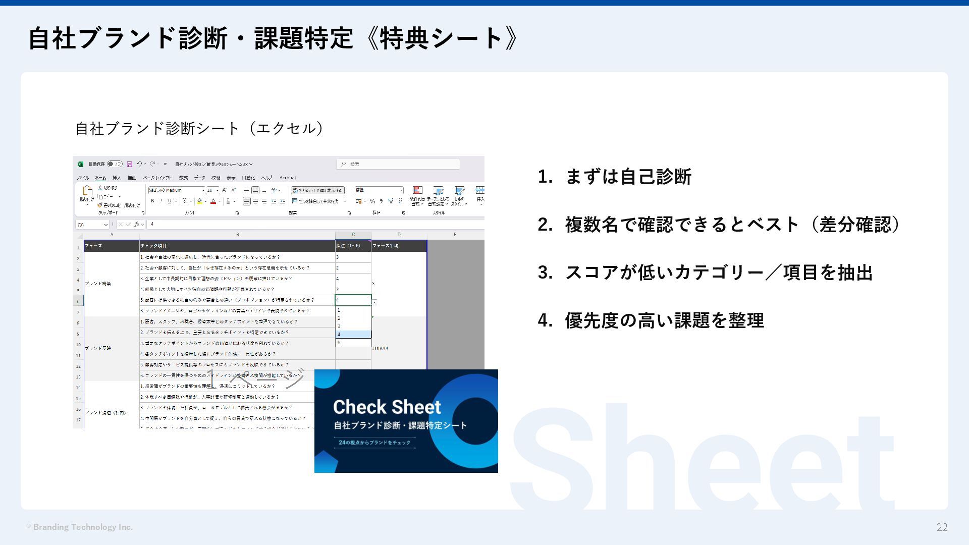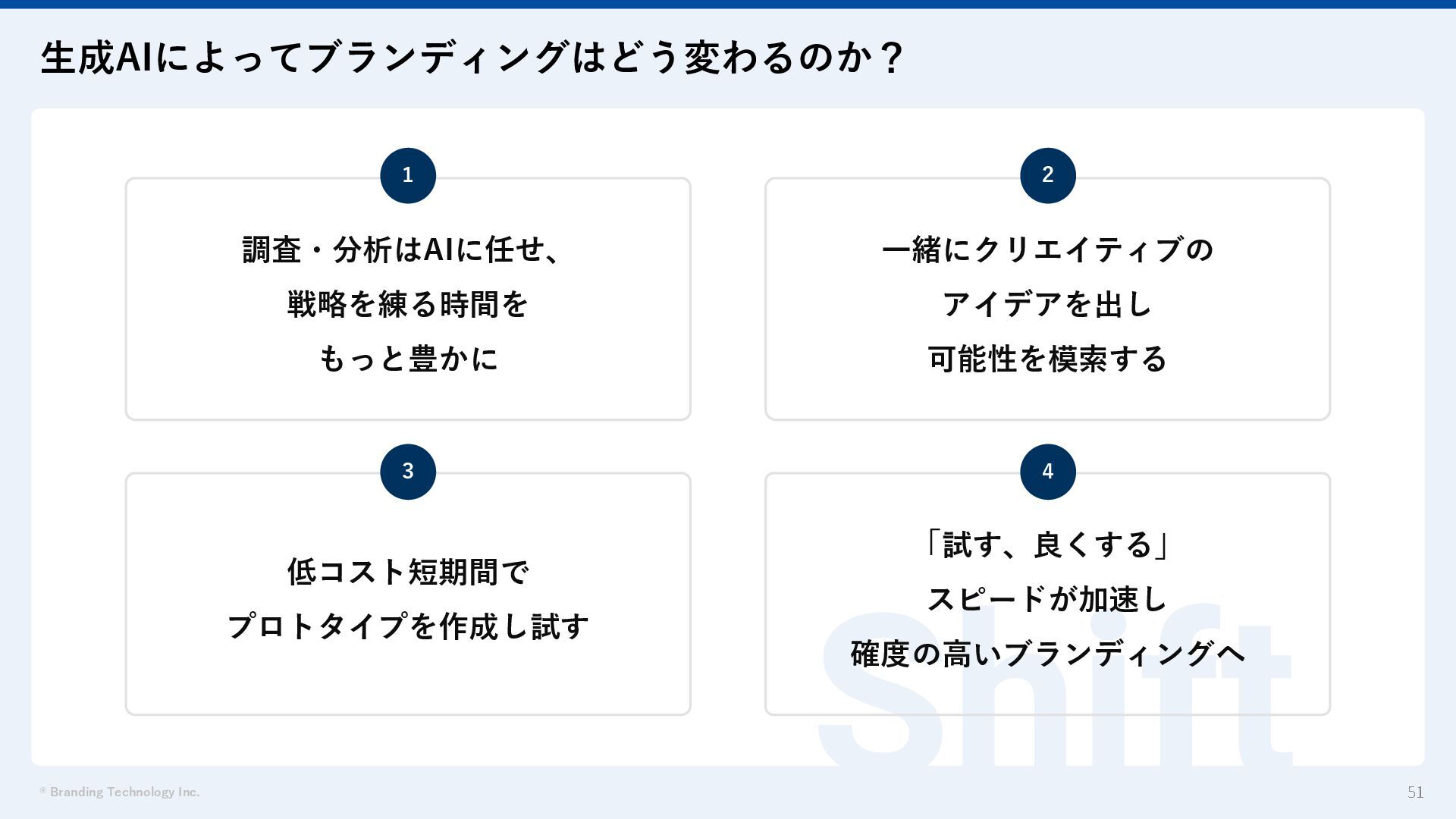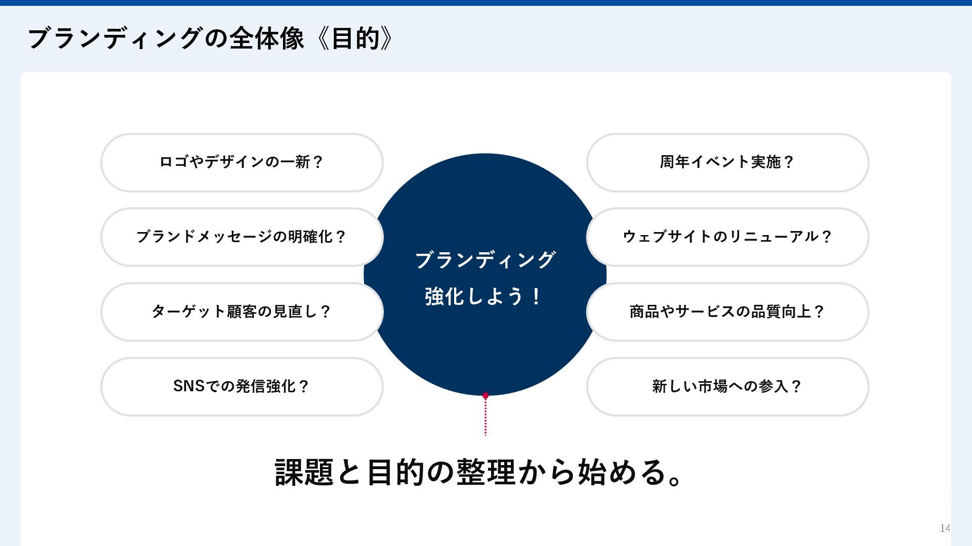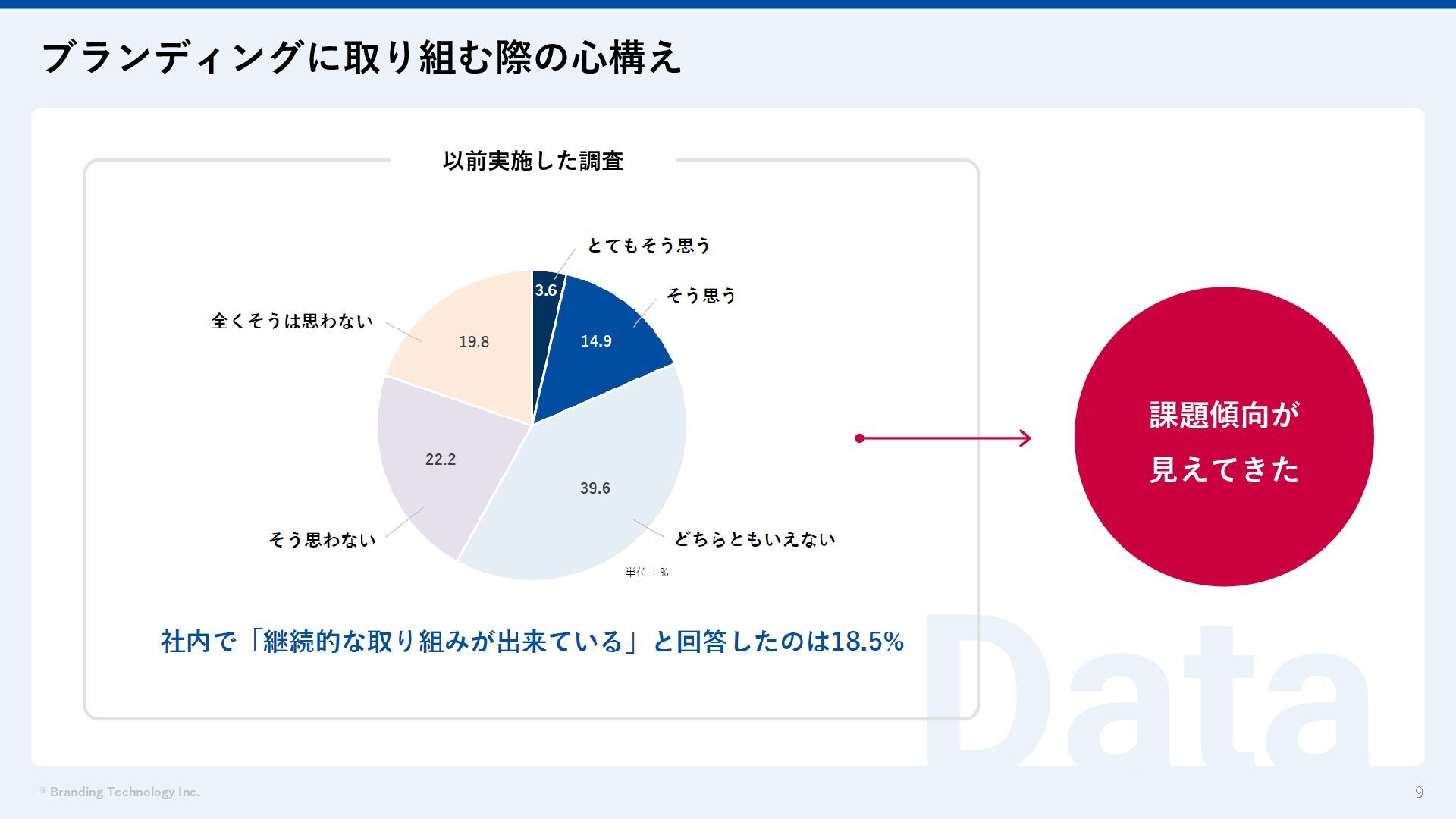 認識できる状態をつくる インナーブランディング 《初期・認識》 1 スタッフへの継続的な浸透施策から ブランドへの共感度を高めていく インナーブランディング 《中期・共感》 2 ブランドに共感し体現する スタッフを増やしていく インナーブランディング 《後期・体現》 3 顧客が自社のブランドを 認識できる状態をつくる アウターブランディング 《初期・認識》 1 顧客への継続的な浸透施策から ブランドへの共感度を高めていく アウターブランディング 《中期・共感》 2 ブランドに共感し推奨してくれる 顧客を増やしていく アウターブランディング 《後期・共鳴》 3 並行して浸透・相互作用が生まれる