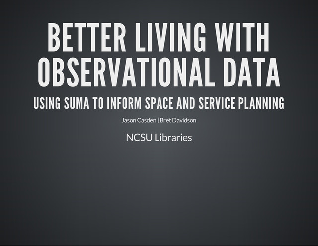 service patterns Study room reservations Technology and furniture use Use of specialized spaces (e.g. Graduate Commons) Comparing branch and main libraries, at different times of day Special Collections researcher services Turnaways (e.g. Technology Lending) Combine with other data: circulation, gate counts, tech lending, reserves, online services