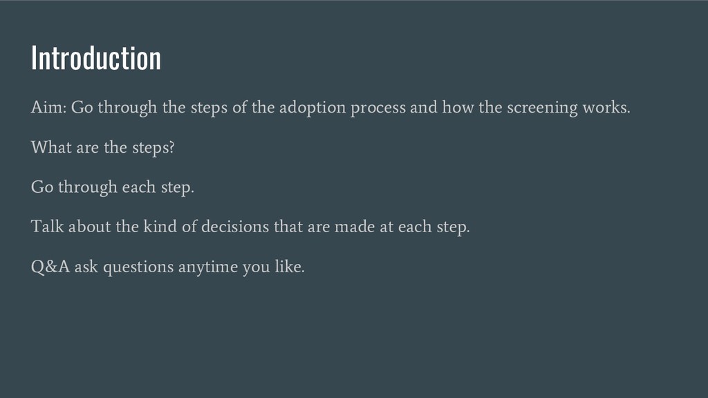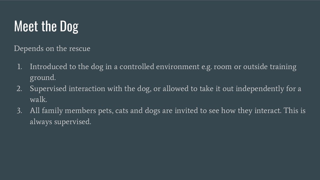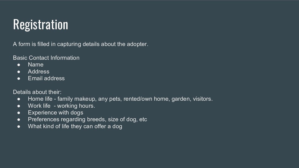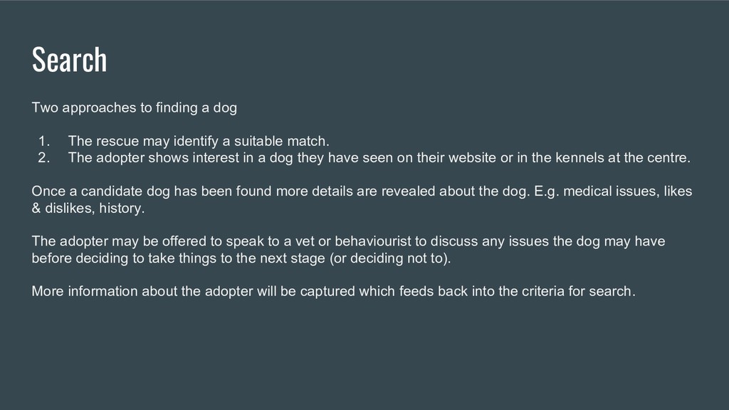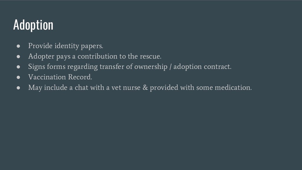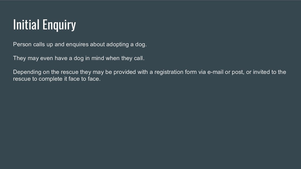 Provides an overview of the process someone goes through when they consider adopting a dog from the initial enquiry to the day they get the dog.
