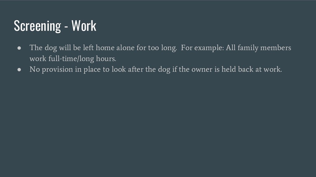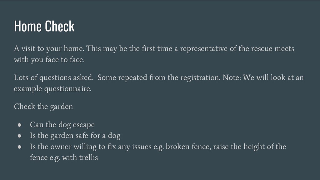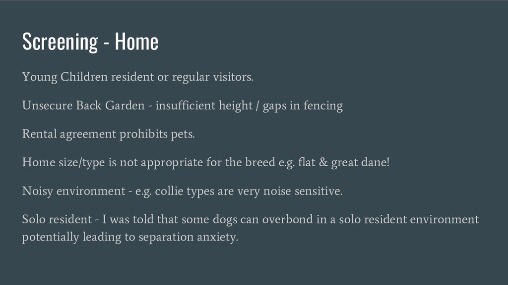 Also provides some examples of why an adopter and dog may not be suitable for each other and why a rescue would turn down a prospective adopter.