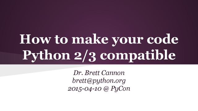 You know Python 3 is an improvement over Python 2 and you want to use it. Unfortunately you have legacy Python 2 source code that needs to stay compatible. But don't fret! This talk will show you that you can make your code be Python 2/3 source-compatible using various tools to pick up the nitty-gritty work and help modernize your Python code to newer Python 2 practices.