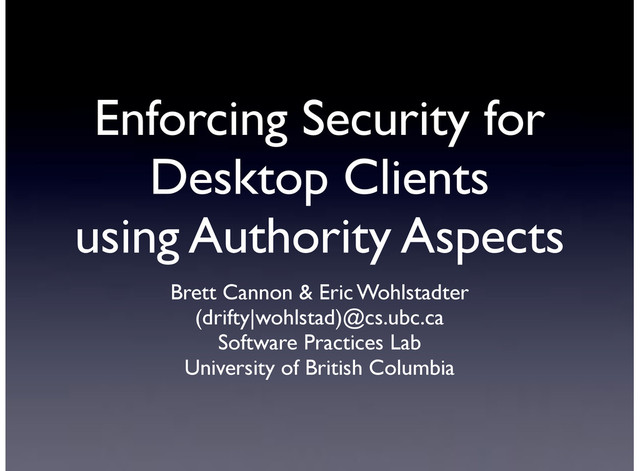 the user downloads. • User weaves aspect library with application to secure the application. • Application starts with no authority. • Authority derived at run-time from: • HTML, RSS, Atom, XML • HTTP, local disk • SWT, Swing