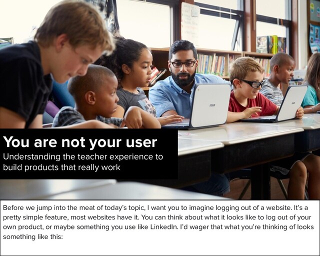 “You are not your user” is a common adage in the world of product and design, and is particularly true when building products for K-12 schools. In the fall of 2019, I gave a talk at EdSurge Immersion on my favorite “you are not your user” insights from five years of working in edtech.