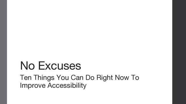 There are too many excuses for overlooking accessibility and inclusive design and I'm tired of hearing them. If you have ever used one of these excuses (or have never heard of accessibility and inclusive design), then it's time to revise your design process. Let's start by looking at things you can start doing differently today. In this session, I’ll cover ten simple steps you can take to improve accessibility in your content, along with some tools to help you recruit and teach others to join you in this effort and create new standards. No excuses!