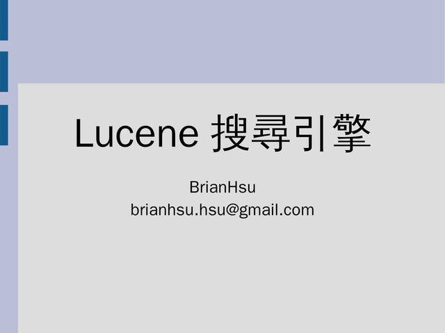 – 一份索引檔裡有 0~N 個 Lucene Document • Lucene 欄位 – 每一份 Lucene Document 有 0~N 個 Lucene 欄位 – key1=[value1, value2, value3] – key2=[value1, value2, value3] • 觀察索引檔工具 – http://code.google.com/p/luke/