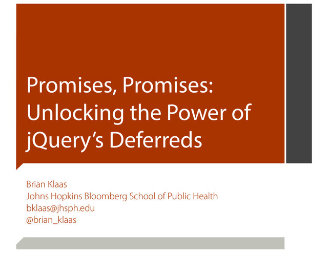 () { console.log('calling promiseTwo'); return promiseTwo; }).then(function () { console.log('All done'); }); A Cleaner $.then() 9-thenExampleCleaner.html You need to return a promise from then() if you want to chain it.