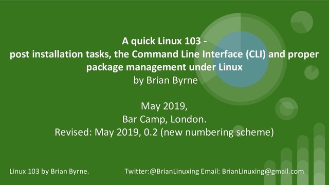 Line Interface (CLI) and proper package management under Linux by Brian Byrne May 2019, Bar Camp, London. Revised: May 2019, 0.2 (new numbering scheme) Linux 103 by Brian Byrne. Twitter:@BrianLinuxing Email: [email protected]