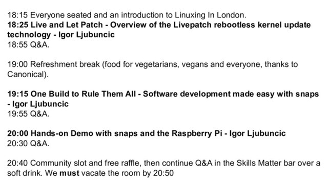 18:25 Live and Let Patch - Overview of the Livepatch rebootless kernel update technology - Igor Ljubuncic 18:55 Q&A. 19:00 Refreshment break (food for vegetarians, vegans and everyone, thanks to Canonical). 19:15 One Build to Rule Them All - Software development made easy with snaps - Igor Ljubuncic 19:55 Q&A. 20:00 Hands-on Demo with snaps and the Raspberry Pi - Igor Ljubuncic 20:30 Q&A. 20:40 Community slot and free raffle, then continue Q&A in the Skills Matter bar over a soft drink. We must vacate the room by 20:50