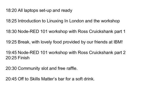 In London and the workshop 18:30 Node-RED 101 workshop with Ross Cruickshank part 1 19:25 Break, with lovely food provided by our friends at IBM! 19:45 Node-RED 101 workshop with Ross Cruickshank part 2 20:25 Finish 20:30 Community slot and free raffle. 20:45 Off to Skills Matter’s bar for a soft drink.