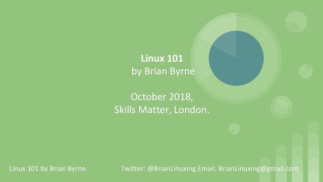 lot of information to take in, it's best done in pairs or as team. I will come around and help during the workshop, but please do write things down, I talk a lot! Linux 101 by Brian Byrne. Twitter: @BrianLinuxing Email: [email protected]